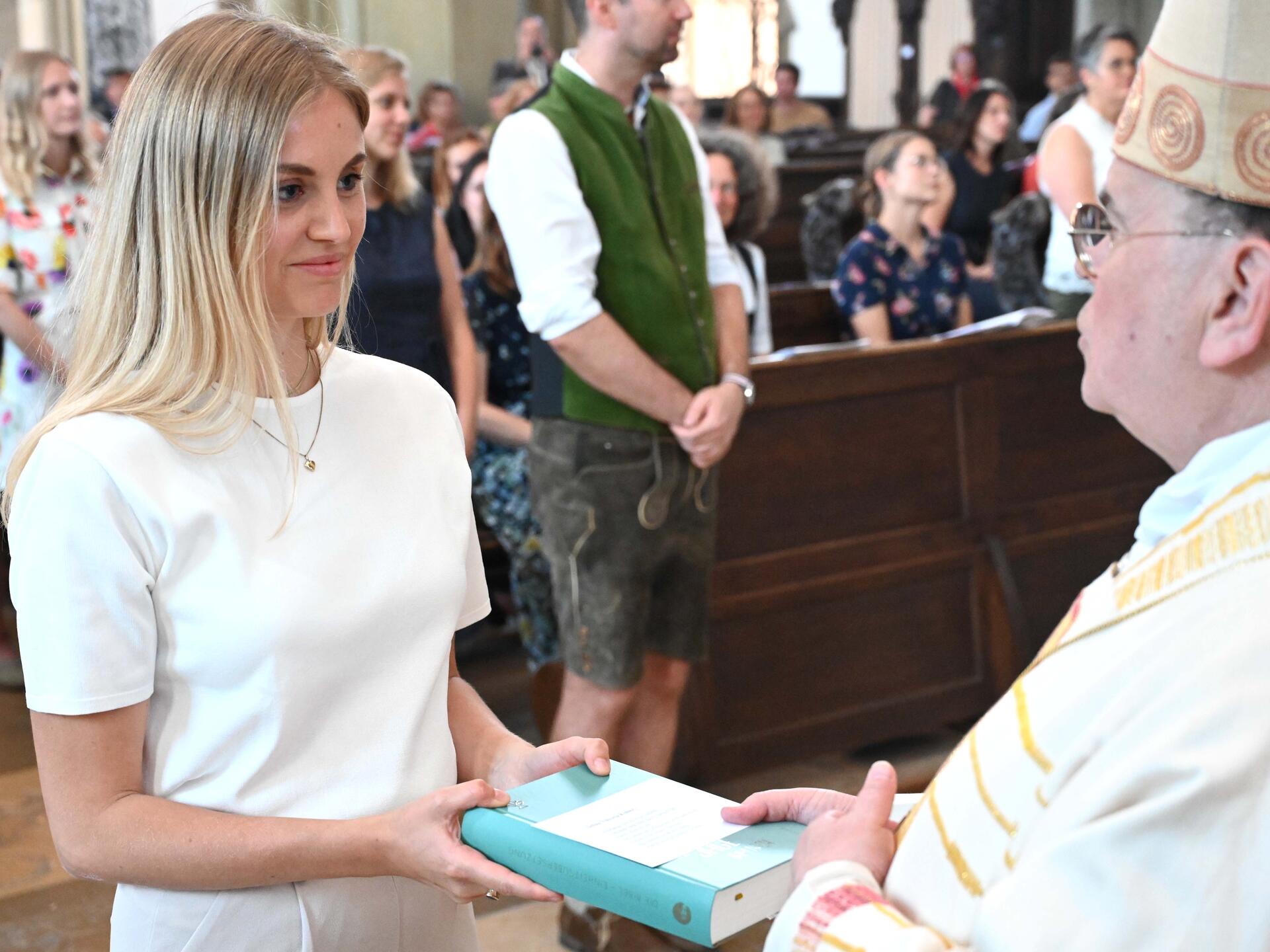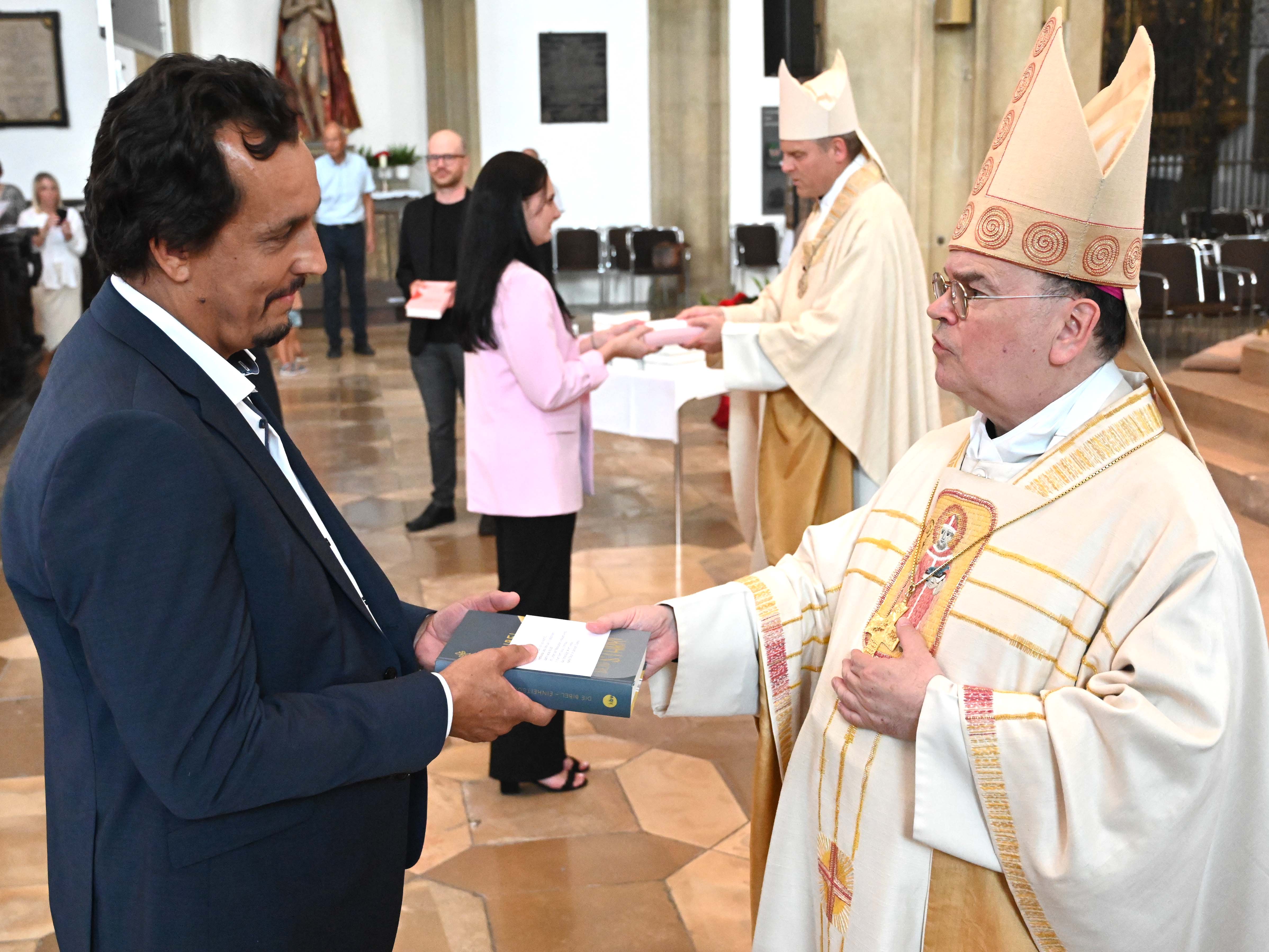 Nach der Predigt traten die neuen Lehrkräfte einzeln nach vorn und erhielten aus den Händen von Bischof Bertram und Weihbischof Florian zum Zeichen ihrer Sendung eine Bibel.