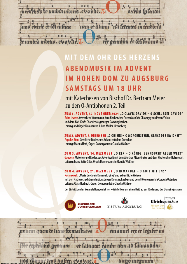 Augsburg (pba). Gesprochenes und gesungenes geistliches Wort prägen in der nahenden Adventszeit wieder die Konzertreihe „Cantate Domino“ im Hohen Dom zu Augsburg. Umrahmt von adventlichen Klängen der Augsburger Dommusik und Gastchören komplettiert Bischof Dr. Bertram Meier am Vorabend der vier Adventssonntage um 18 Uhr seine Katechesen-Reihe zu den sogenannten O-Antiphonen aus dem Stundengebet der Kirche.