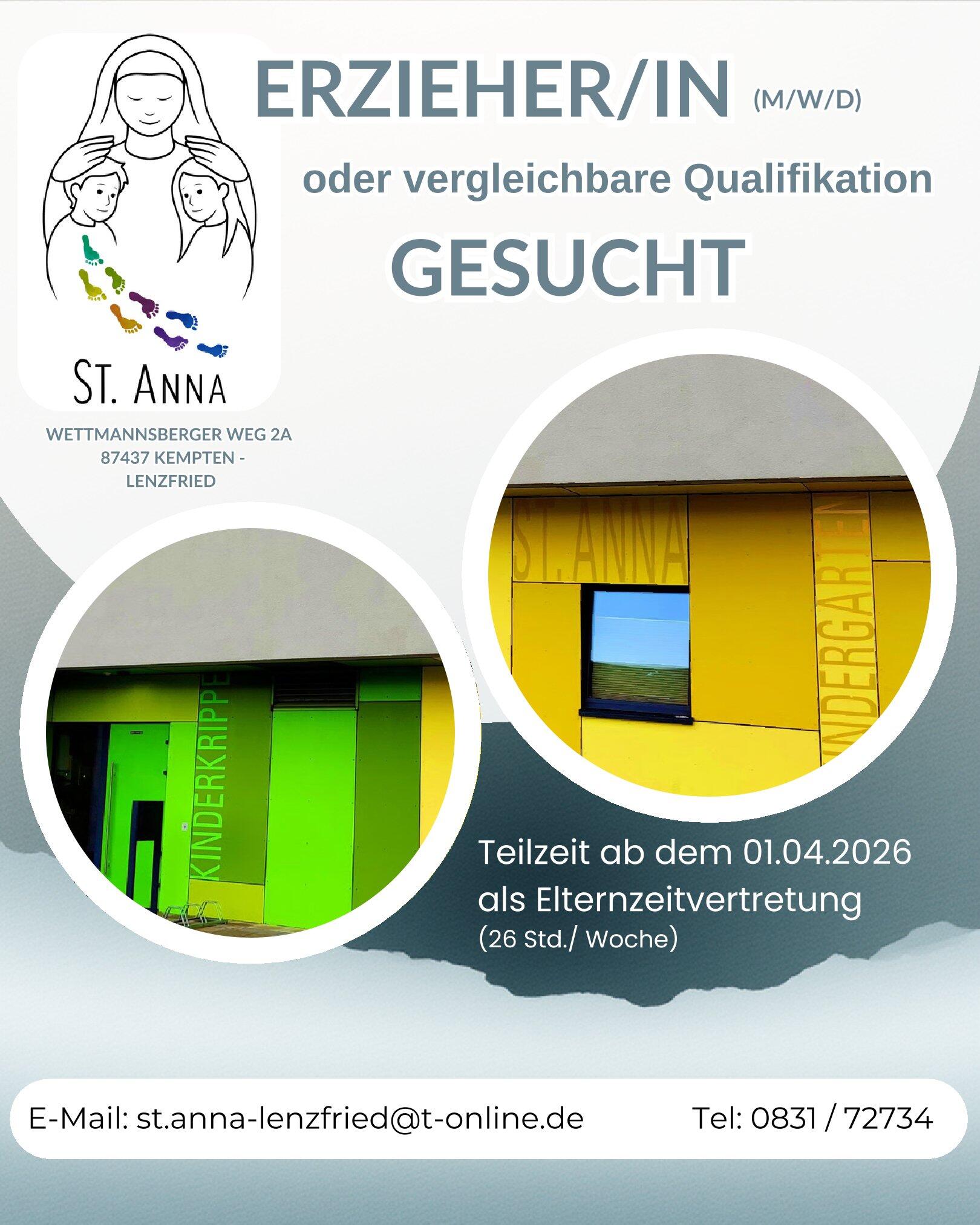 Erzieherin in Teilzeit als Elternzeitvertretung ab 01.04.26 in St. Anna in Lenzfried gesucht (m/w/d)