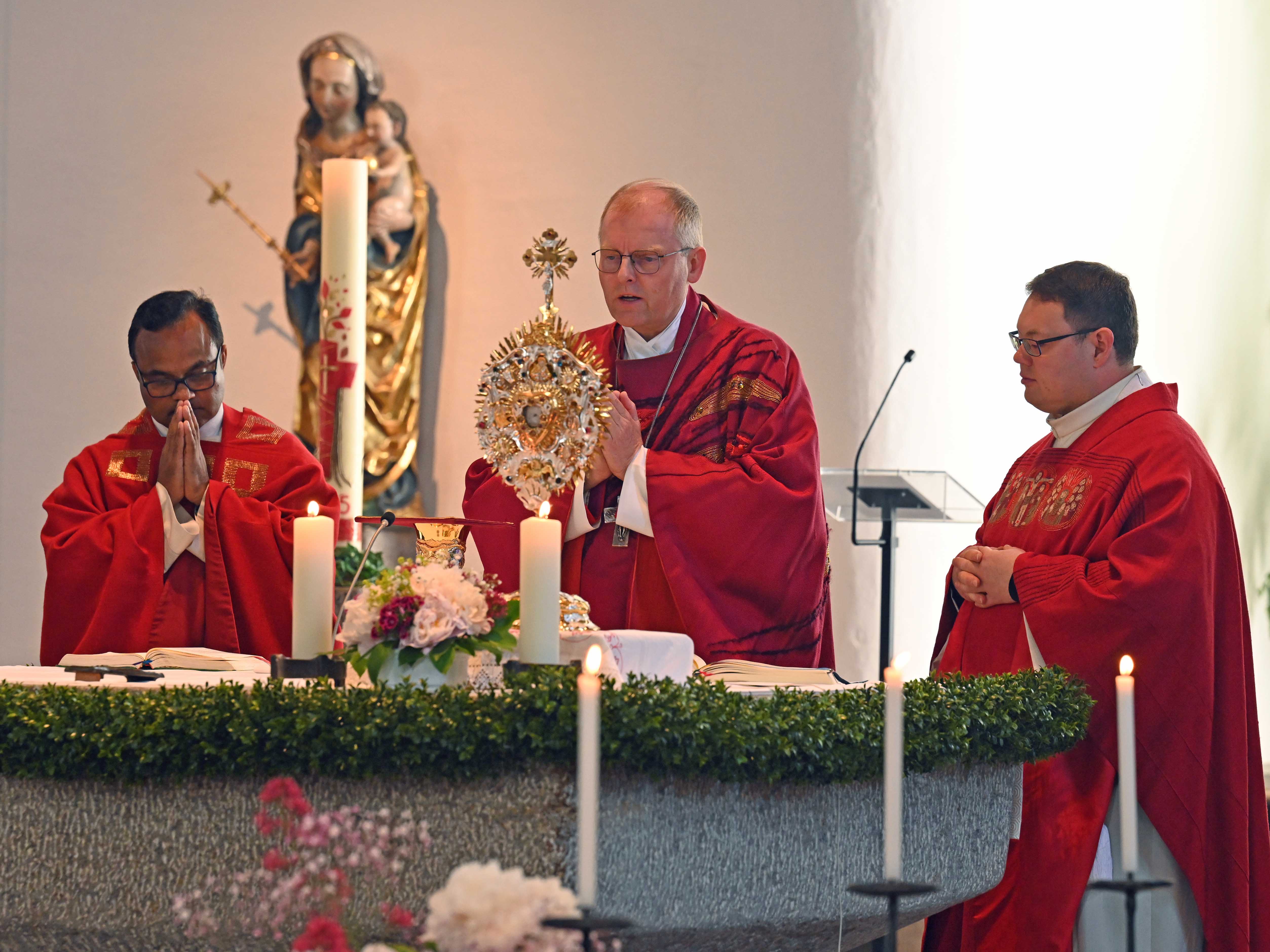 Viele Menschen könnten kein Blut sehen, sagte der Weihbischof zu Beginn seiner Predigt. Die Verehrung des Blutes Jesu sei für Menschen außerhalb der Kirche schwer zu verstehen. Dabei habe schon der Prophet Jesaja vorhergesagt, „sie werden auf den blicken, den sie durchbohrt haben“. Der Tod Jesu beglücke unsere Rettung, unser Leben. Jesus bringe wirklich Erlösung, Rettung und Heil.