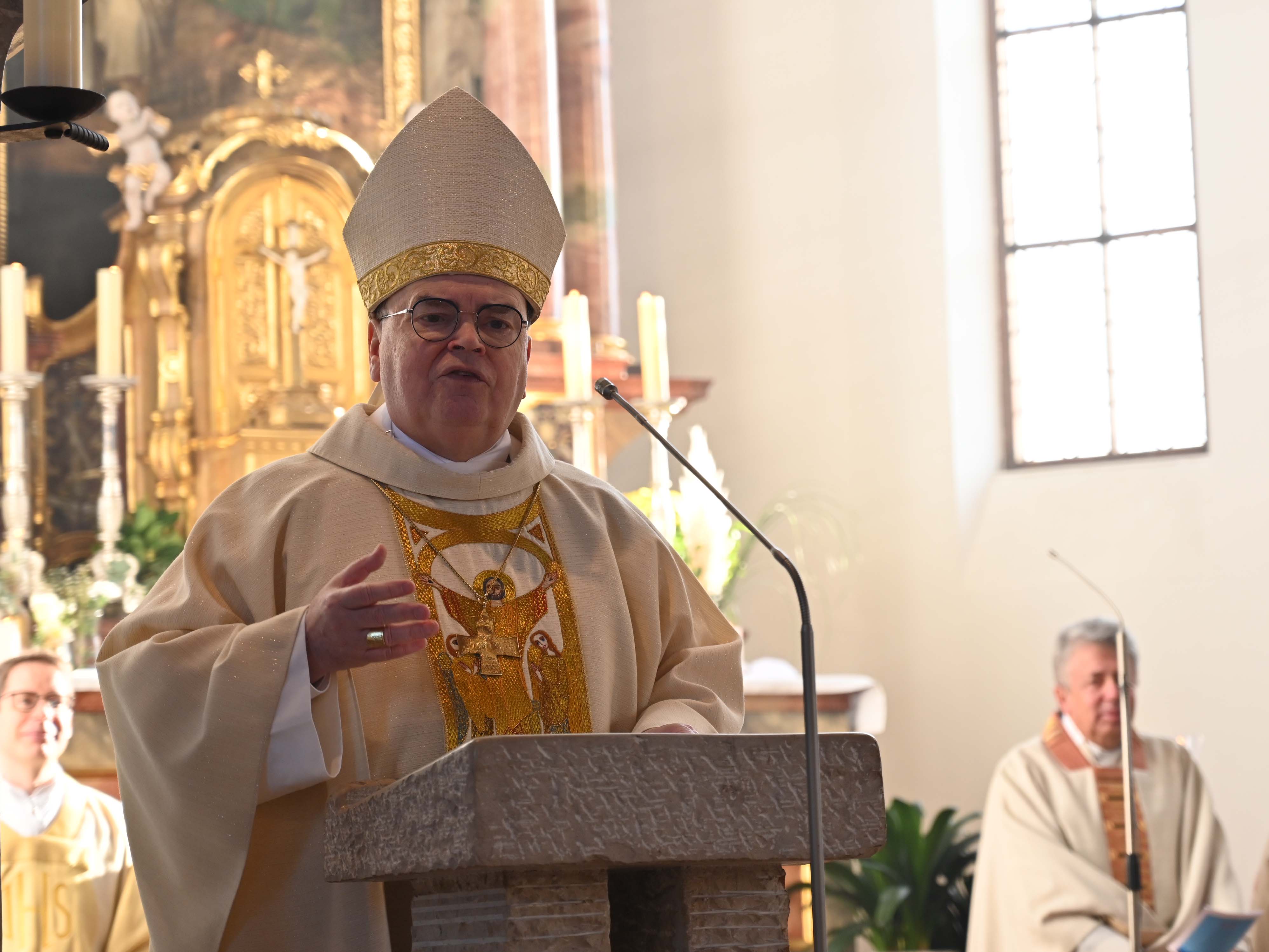 Um Jesus nachzufolgen, eine Beziehung zu ihm aufzubauen, brauche es keine Superkräfte, betonte der Bischof und räumte mit der Annahme auf, im kirchlichen Dienst ein Held sein zu müssen. „Gott erwartet, dass wir verfügbar sind, aber wir brauchen keine Helden sein.“ Für diese Bereitschaft, die Pläne Gottes anzunehmen und umzusetzen, dankte er auch dem scheidenden Jugendpfarrer, Tobias Wolf sowie seinem Nachfolger, Benedikt Huber. „Ich bin sehr dankbar, dass ihr verfügbar seid“, richtete er sich an die beiden Priester und sprach ihnen zu, vor Gott nicht perfekt sein zu müssen.