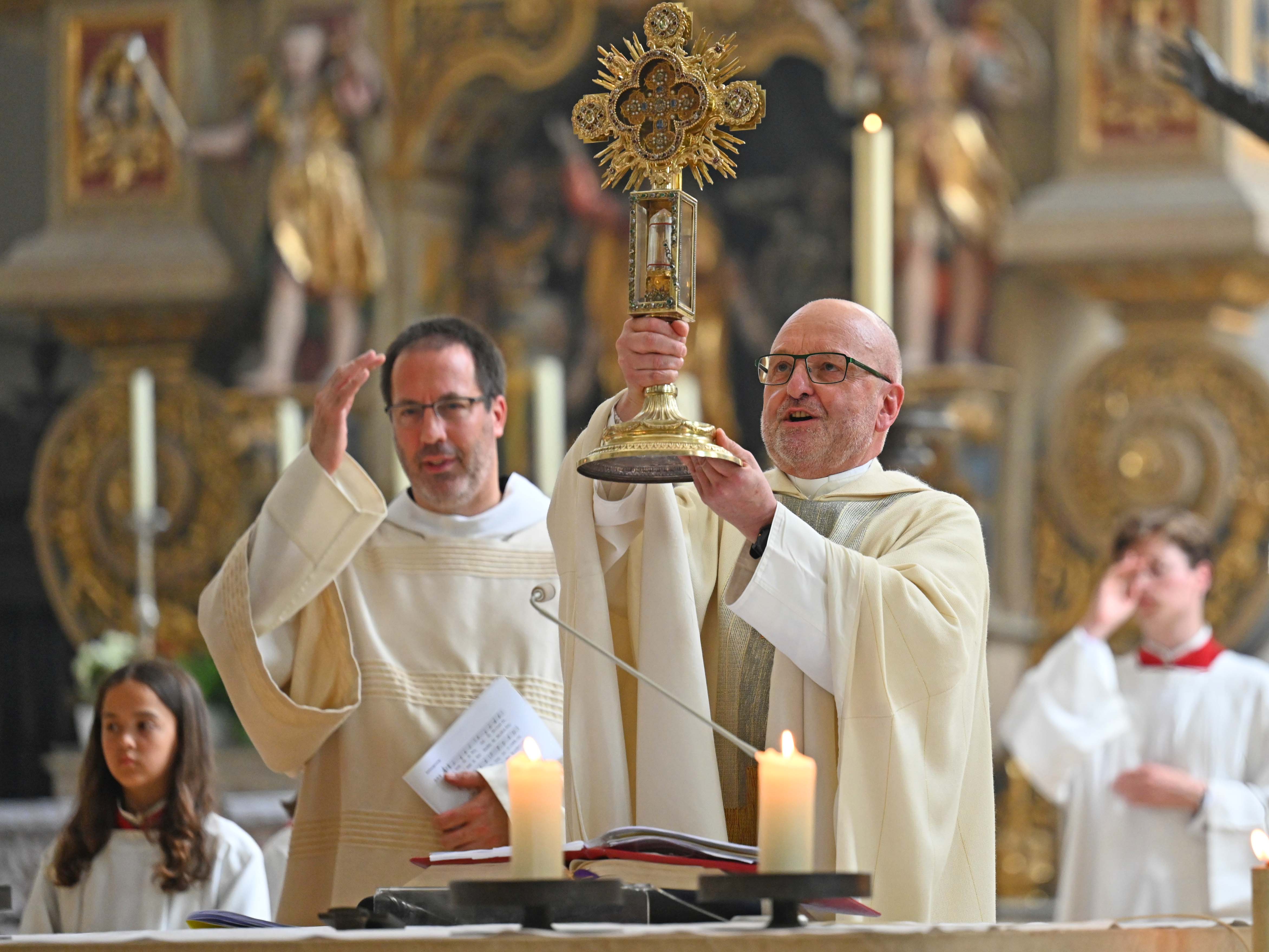 Das Liedprogramm für den gemeinsamen Gottesdienst bestand aus verschiedenen modernen Liedern. So erklang zum Einzug die Hl. Jahr-Hymne „Licht des Lebens“, zum Halleluja „Singen woll’n wir unserem Gott“ sowie als Danklied „Wir sind Gottes Melodie“. Ergänzend wurden Lieder aus dem Augsburger Gotteslobanhang eingesetzt. Auch der Klassiker „Streiter in Not“ durfte nicht fehlen. Kirchenmusiker Peter Bader leitete den riesigen Chor von der Altarinsel aus. So ergab sich ein vielfältiges, lebendiges und vor allem fröhliches Musizieren.