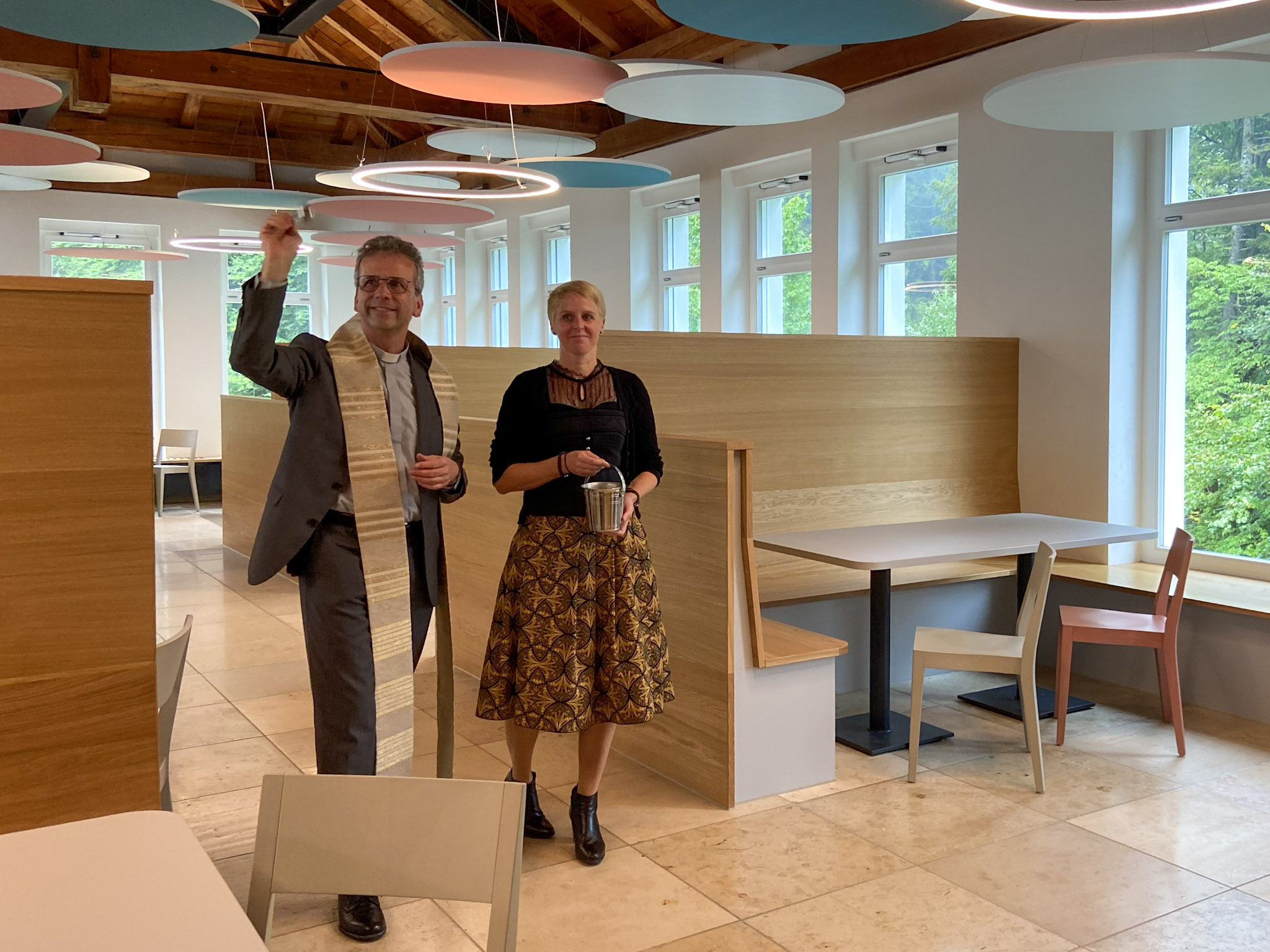 Nach dem Spatenstich segnete Armin Zürn, Augsburger Domkapitular und Aufsichtsratsvorsitzender der KJF Augsburg, die bereits modernisierte Mensa mit generalsanierter Großküche und neu gestalteten Speisesälen. Anschließend konnten die sanierten Räume besichtigt werden.