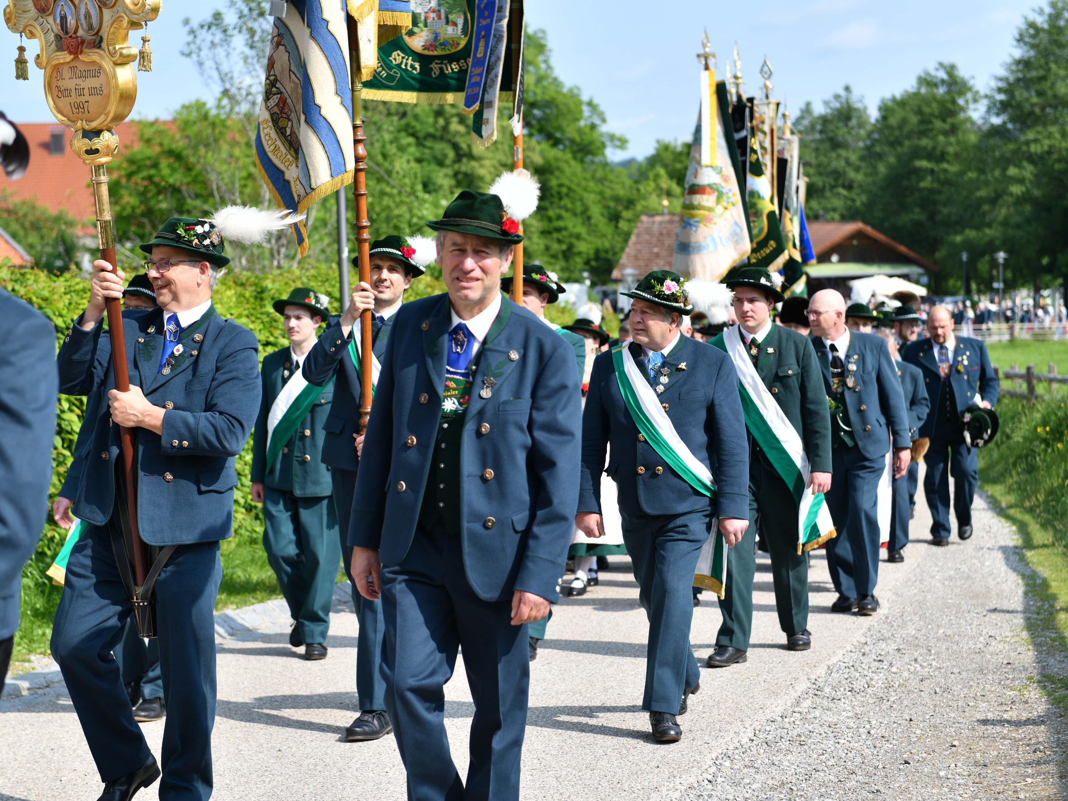 Bereits vor dem Festgottesdienst waren die Frauen und Männer aus 23 verschiedenen Trachtenvereinen des Oberen Lechgaus in ihren festlichen Trachtengewändern und begleitet von zahlreichen Fahnenabordnungen in einem farbenfrohen Zug der Wallfahrtskirche entgegengegangen. Betend zogen sie in die Wieskirche ein und wurden dort von feierlichen Klängen empfangen. Alpenländische Lieder und Zithermusik prägten sodann auch den gesamten Gottesdienst.