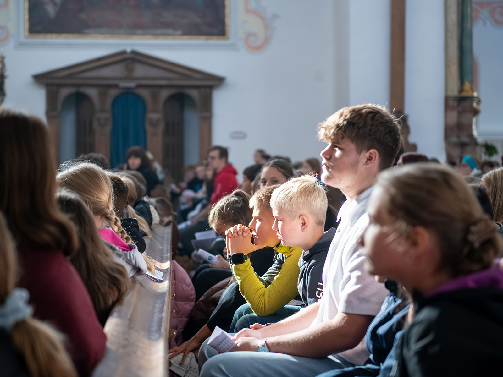 Tatsächlich sei es der Auftrag Christi gewesen, als „lebendige Steine“ im Haus der Kirche zu wirken – eine Mission, die Franziskus damals mit seinen Freunden umsetzte und die zugleich heute noch Ansporn sein solle für Christinnen und Christen in aller Welt: „Auch ihr, meine lieben Schülerinnen und Schüler, liebe Studierende, seid lebendige Steine im Bau der Kirche. Kommt, bauen wir gemeinsam die Kirche wieder auf!“ Doch habe Franziskus nicht nur große Gedanken entfaltet, sondern diesen auch stets Taten folgen lassen – damals in Assisi mit einem handfesten Eklat, als er sich mitten auf dem Hauptplatz seiner Heimatstadt nackt ausgezogen habe als Zeichen seiner inneren Umkehr und seiner unbedingten Solidarität mit den Armen: „Franziskus hatte die Seiten gewechselt. Nicht mehr auf der Seite der Reichen und Schönen wollte er stehen, sondern ganz auf der Seite der Armen. Und das ist es, was ich euch auch wünsche, dass ihr immer wieder ein Auge habt für Menschen am Rande, für Leute, denen es nicht so gut geht wie uns.“
