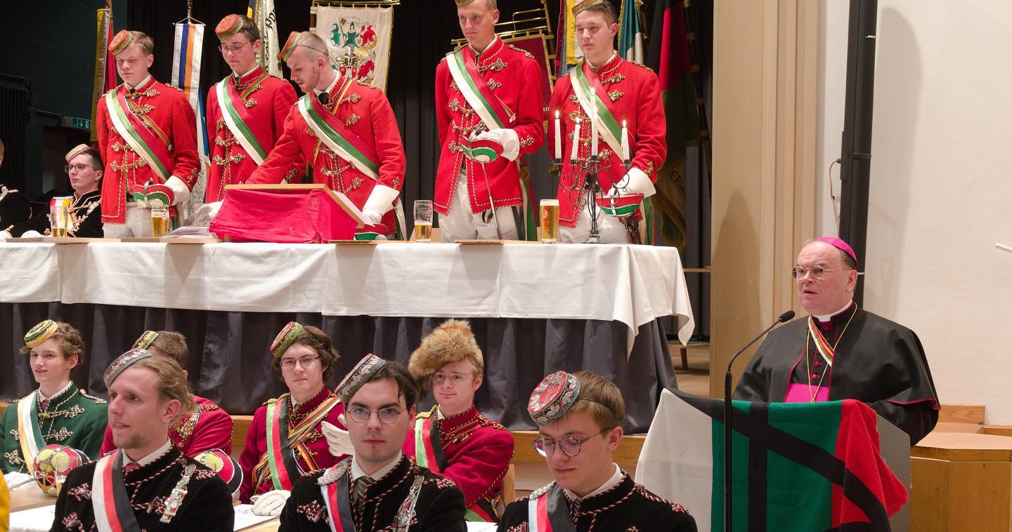 Eine Frage, mit der Bischof Bertram – selbst CV-Mitglied und Träger des Algovenbandes – nicht nur die Aufmerksamkeit der Frauen und Männer im Saal auf seine Seite zog, sondern wohl auch den Gesprächsfaden aus dem Alltag der anwesenden Akademiker aufnahm. Er wollte mit seiner Rede „geistlich herausfordern“, aber auch „mit Erkenntnis und Freude erfüllen“. Denn viele Christinnen und Christen würden schnell unsicher, wenn sie auf eine solche Frage hin Stellung beziehen müssten, bemerkte der Bischof. Und er gab selbstkritisch zu bedenken: „Welche Existenzberechtigung hat eine Institution, die sich in den Augen vieler selbst abgeschafft hat? Wir machen Schlagzeilen, aber negative.“