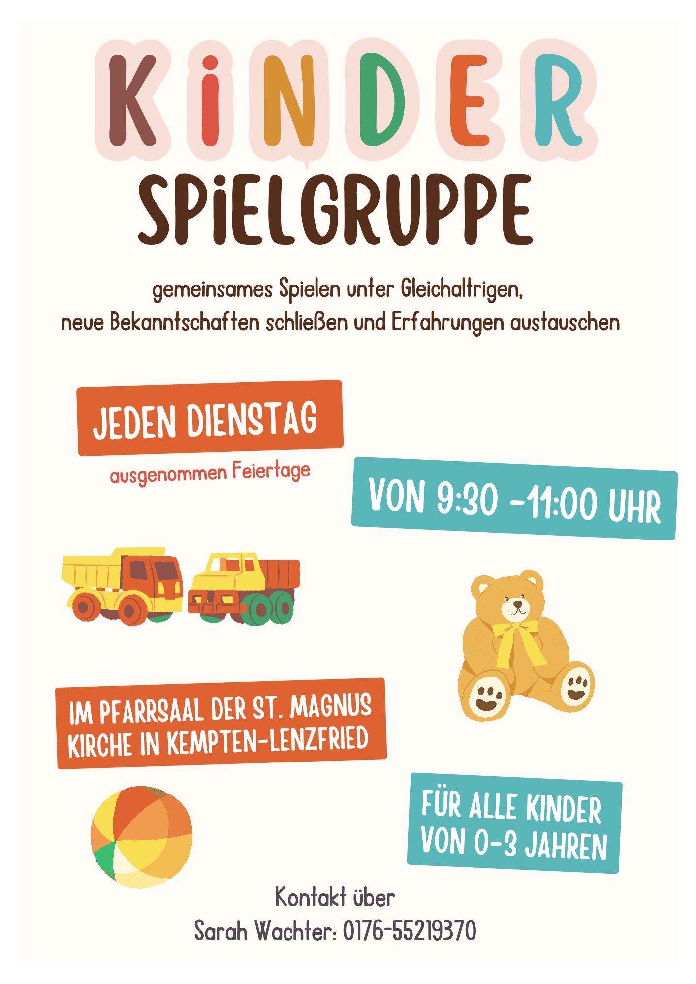 Jeden Dienstag trifft sich die Spielgruppe Lenzfried von 9.30 bis 11.00 Uhr (ausgenommen Feiertage) im Pfarrsaal St. Magnus zum gemeinsamen Spielen unter Gleichaltrigen (0 – 3 Jahre), um neue