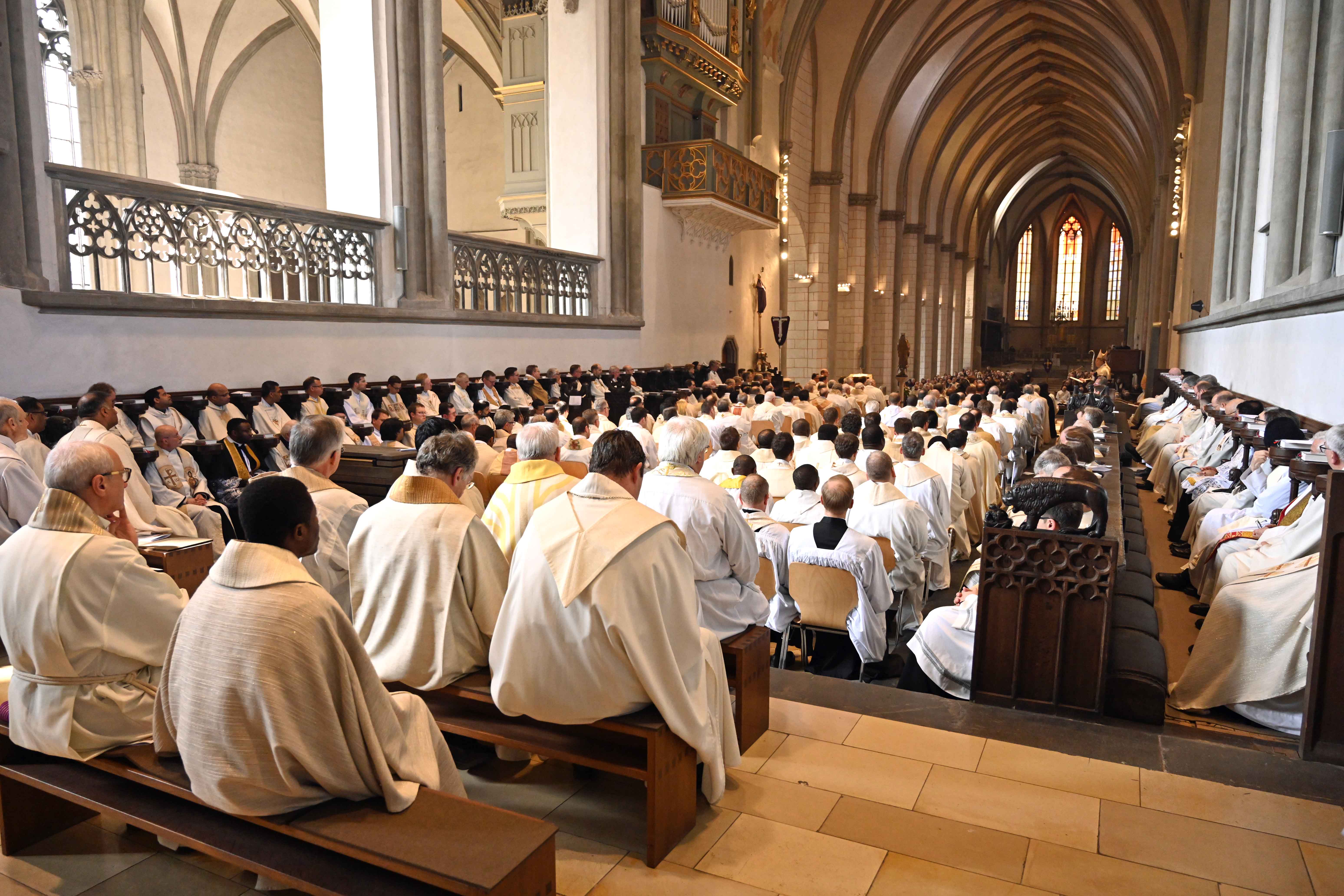 Seine Mitbrüder im Chorraum konfrontierte er schließlich mit provokativen Fragen nach dem eigenen Standort. „Stehen wir hilflos im gesellschaftlichen Abseits, nicht selten aufgrund der schändlichen Missbrauchsgeschichte konfrontiert mit Argwohn und Verdacht? Wo ist unser Platz?“ (…) „Wozu brauchen wir überhaupt noch Priester?“ Auf dem Synodalen Weg habe es durchaus Stimmen gegeben, die deutlich vernehmbar von einer priesterlosen Kirche träumten, um so angeblich „die wahre und ursprüngliche Form des Evangeliums freizulegen“.