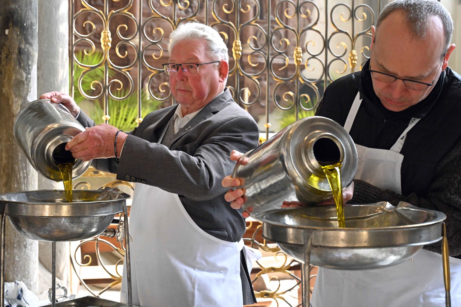 Auf die Predigt und die Erneuerung der Bereitschaft zum priesterlichen Dienst folgte im Anschluss dann die Weihe der heiligen Öle. In einer feierlichen Prozession wurden diese in großen Gefäßen in den Altarraum getragen: Das Katechumenenöl brachten Mitglieder des Ritterordens vom Heiligen Grab zu Jerusalem zum Altar, das Krankenöl Mitarbeiterinnen und Mitarbeiter der Klinikseelsorge und das Chrisamöl schließlich zwei Ständige Diakone. Nach dem Gottesdienst wurden die drei heiligen Öle, insgesamt waren es 100 Liter, in kleinere Behälter abgefüllt, versiegelt und an Frauen und Männer aus den einzelnen Dekanaten verteilt.