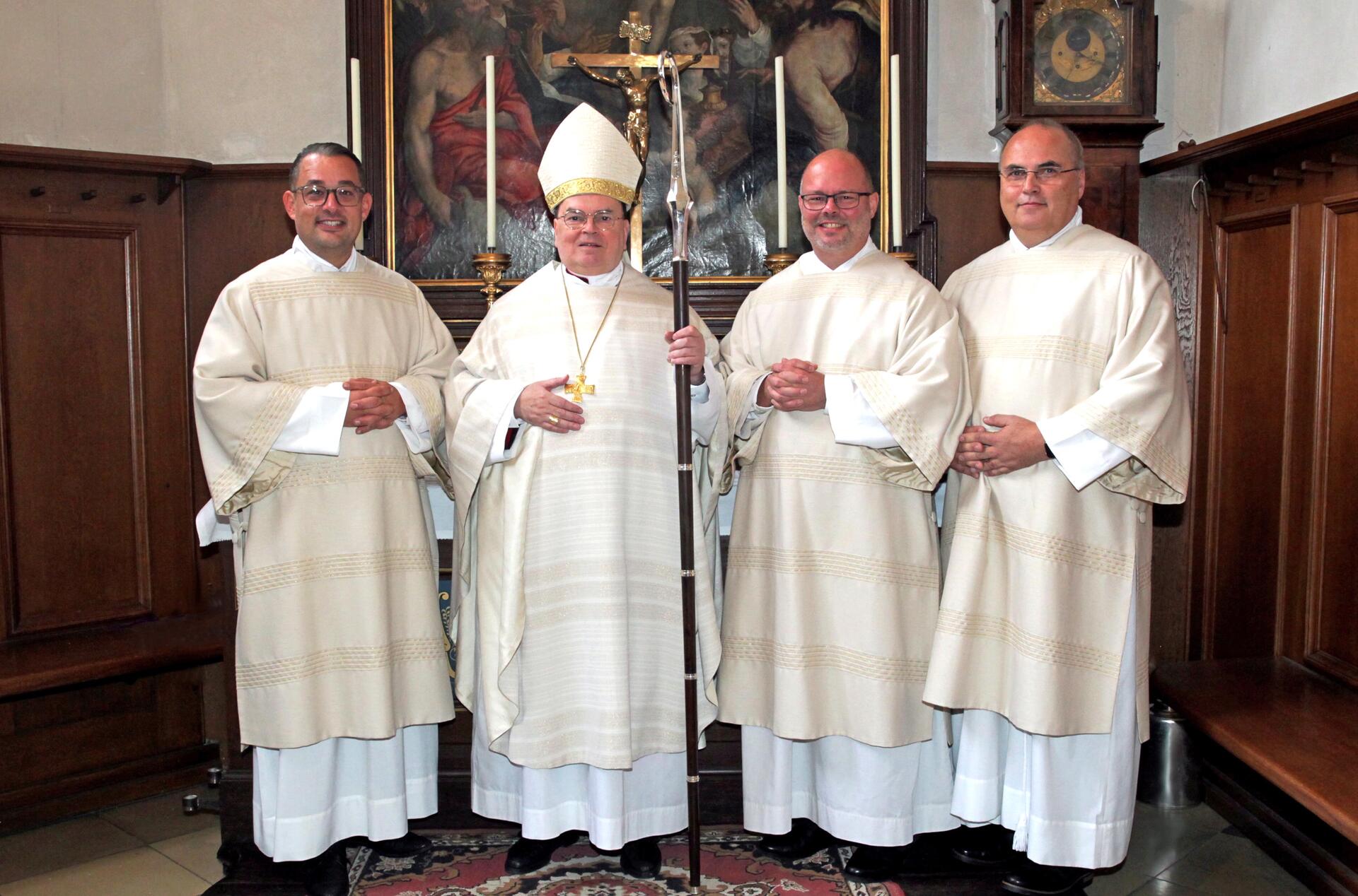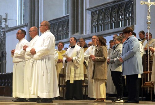 Mit der Weihe erhielten die Kandidaten schließlich den Auftrag, Jesus Christus als „ersten Diakon inmitten des Volkes Gottes zu repräsentieren“ und damit seinen Lebensstil wachzuhalten, so Bischof Bertram. „Bei allen äußeren Aktivitäten und Handlungen, die dem Diakon zukommen, soll dies die Innenseite des Diakonats sein.“ Im Alltag mit Unverständnis und Widerspruch konfrontiert zu werden sei nicht immer angenehm und „vergnügungssteuerpflichtig“, mahnte der Bischof. Aber solche Momente könnten dazu beitragen, die eigene Berufung zu vertiefen.