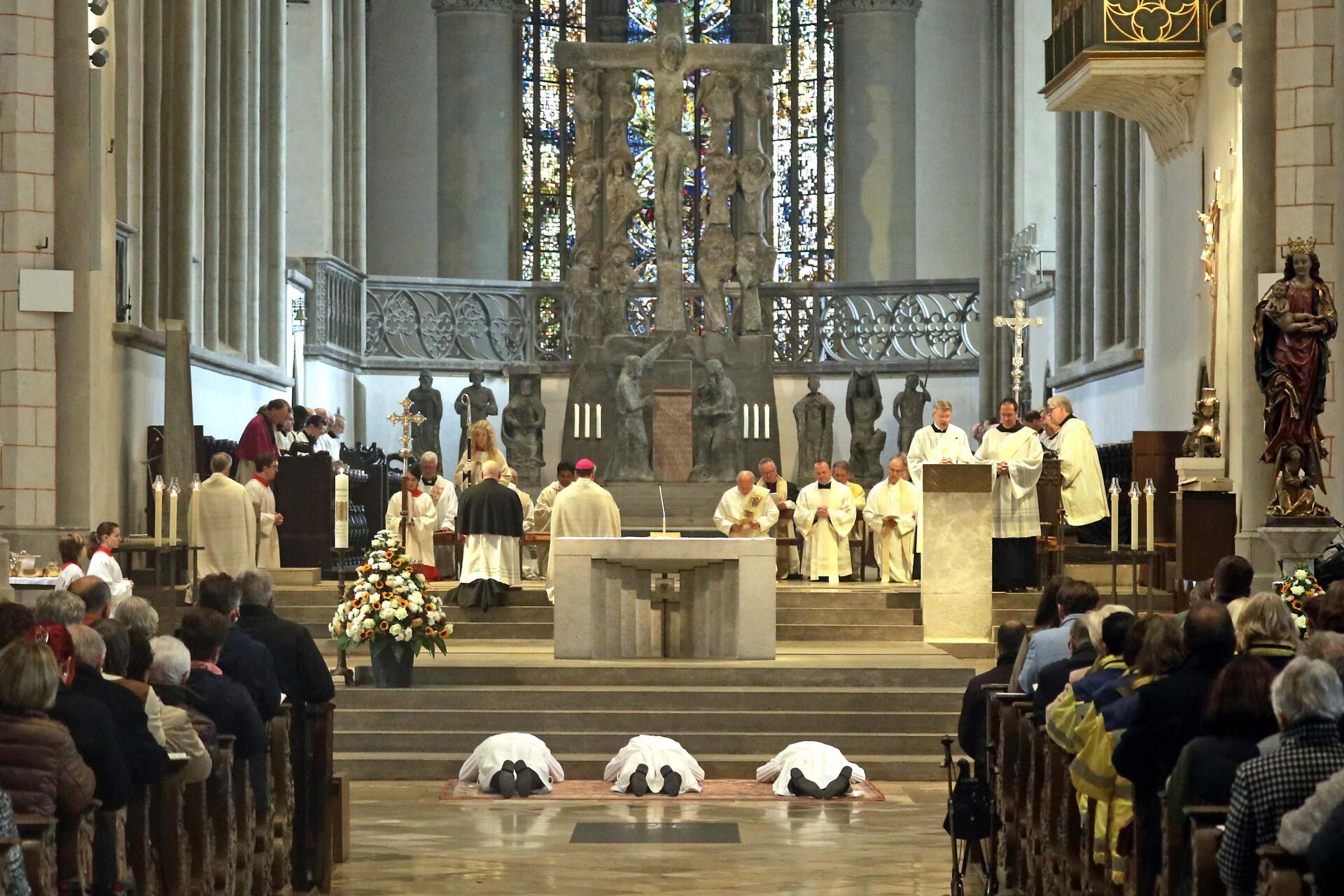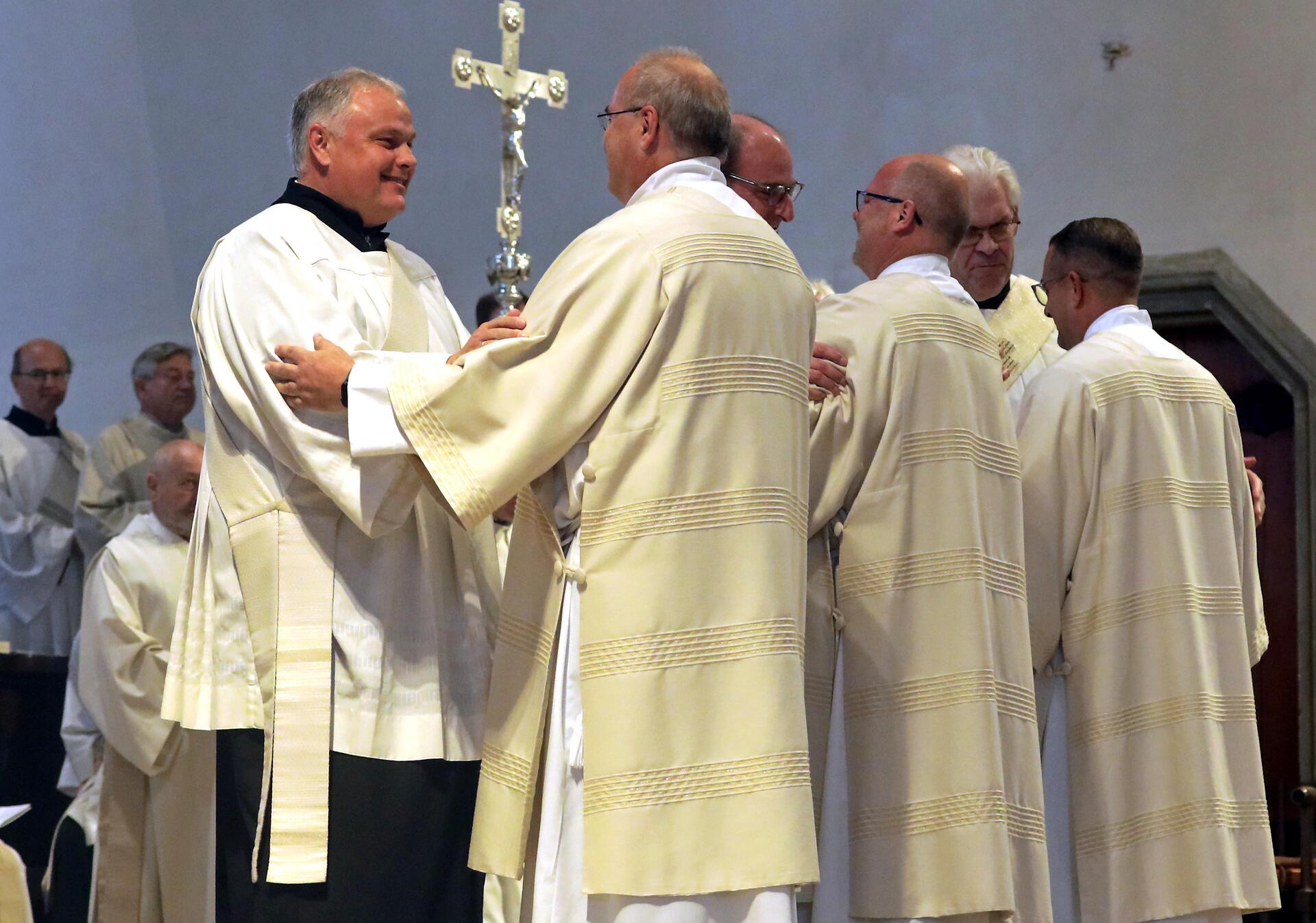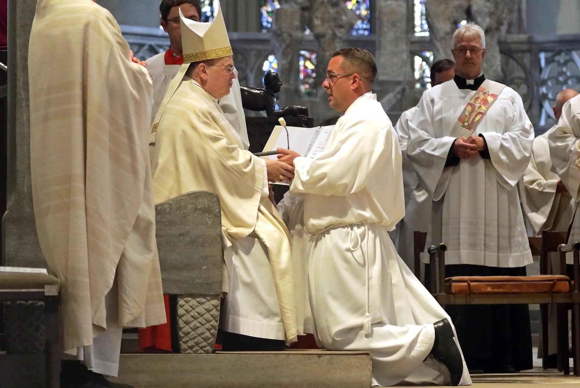 In den ausdeutenden Riten wurde zeichenhaft sichtbar, was den drei neuen Diakonen zuteilwurde. Sie legten Stola und Dalmatik an und empfingen das Evangeliar aus den Händen und mit den Worten des Bischofs „Was du liest, ergreife im Glauben; was du glaubst, das verkünde, und was du verkündest, erfülle im Leben.“
