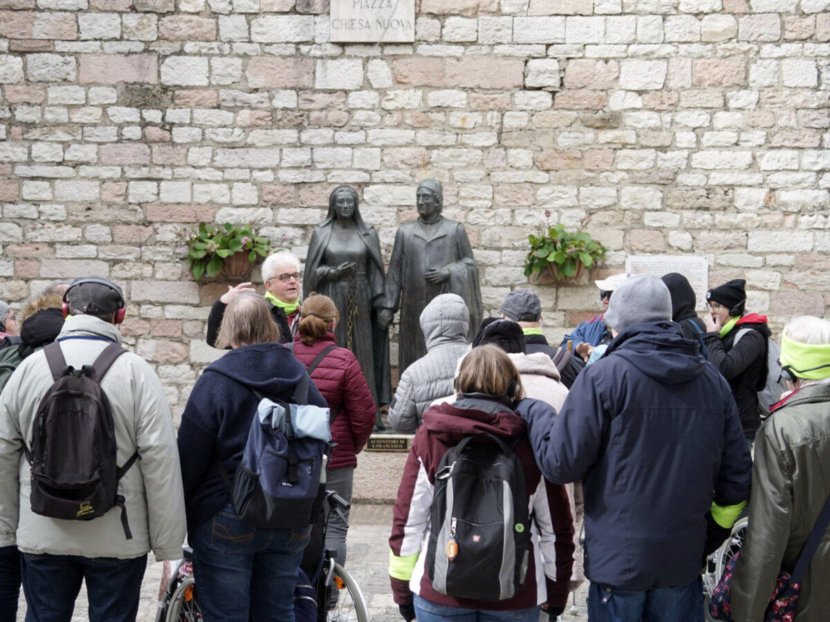 Unter der Leitung von Diakon Thomas Schmidt und der Referentin mit Schwerpunkt Sehbehindertenpastoral Carolin Aumann besuchten die Pilgerinnen und Pilger die Stätten des Lebens und Wirkens der heiligen Klara und des heiligen Franziskus, angefangen mit den Elternhäusern und den Lebensereignissen der beiden Heiligen bis hin zur jeweiligen Berufungs-und Ordensgeschichte. Der deutsche Franziskanerbruder Thomas Freidel zeigte dies besonders anschaulich anhand der Lebensbilder der Heiligen in San Francesco, die der mittelalterliche Künstler Giotto di Bondone geschaffen hatte. Besonders beeindruckend war die gute Atmosphäre in der Gemeinschaft und in den Gottesdiensten. Die Osternacht in San Francesco und die eigene Feier der Karfreitagsliturgie in Leichter Sprache in einer Kapelle bei San Francesco wurden dabei als besonders feierlich wahrgenommen und regten zum Nachdenken auch über das eigene Leben an. In den alten, kleinen und für den Franziskanerorden so wichtigen romanischen Kirchen San Damiano und Portiuncula suchten die Teilnehmerinnen und Teilnehmer Zeiten für die Stille und das Gebet.