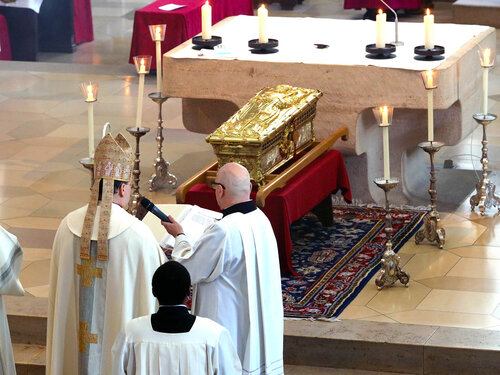 Musikalisch begleitet wurde die gestrige Pontifikalvesper von der Schola der Männerstimmen der Domsingknaben unter der Leitung von Domkantor Dr. Julian Müller-Henneberg sowie von Peter Bader (Orgel) und Stefan Eding (Trompete). Den musikalischen Part während des heutigen Pontifikalamts übernahmen das Ensemble AUXantiqua und die Dombläser unter der Leitung von Domkapellmeister Stefan Steinemann sowie Domorganistin Claudia Waßner (Orgel) und Umberto Kostanić (Chororgel).