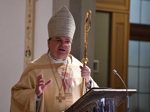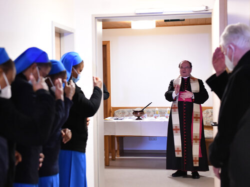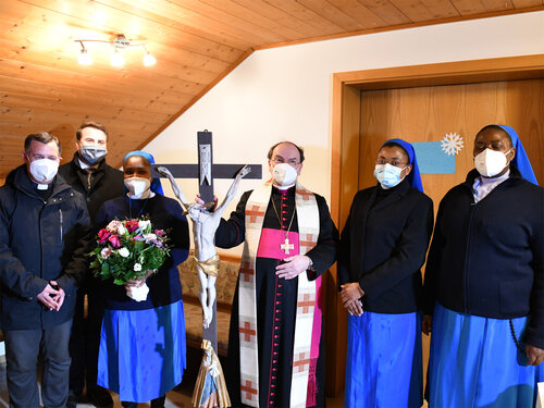 In den Räumlichkeiten des Konvents begrüßte der Bischof die anwesenden Ordensschwestern um die deutsche Regionaloberin Sr. M. Rosemary Ude aus Bonn. In seiner Ansprache betonte er, dass die „Töchter der Göttlichen Liebe“ eine neue Perspektive nach Seeg brächten und dass durch ihre Präsenz der gemeinsame Blick auf Jesus hin geweitet und bereichert würde. „Wer auf Sie trifft, der soll erkennen: Jesus ist nicht nur was für schwäbisch-bayerische Tradition, sondern durch Sie wollen, ja sollen die Menschen Jesus näherkommen“, so der Bischof.Zudem hob Bischof Bertram das sozial-karitative Engagement der Schwestern besonders hervor. Gelebter christlicher Glaube sei auch immer eine Bewegung hin zu den Menschen, besonders zu den Armen, Schwachen und jenen, die gesellschaftlich am Rande stehen. Insofern freue es ihn besonders, dass der Orden seinen Platz beim Caritas-Altersheim in Seeg gefunden habe und sich dort künftig einbringen und engagieren werde.„Wir begrüßen Frauen, die sich auf die Suche gemacht haben, Menschen mit unruhigem Herzen“, sagte der Bischof in seiner Predigt zum nachfolgenden Pontifikalamt. Er wünsche den Schwestern, dass Ihr Herz Ruhe fände in Gott und bei den Menschen, die sie begleiten und denen sie Hilfe sein wollten.