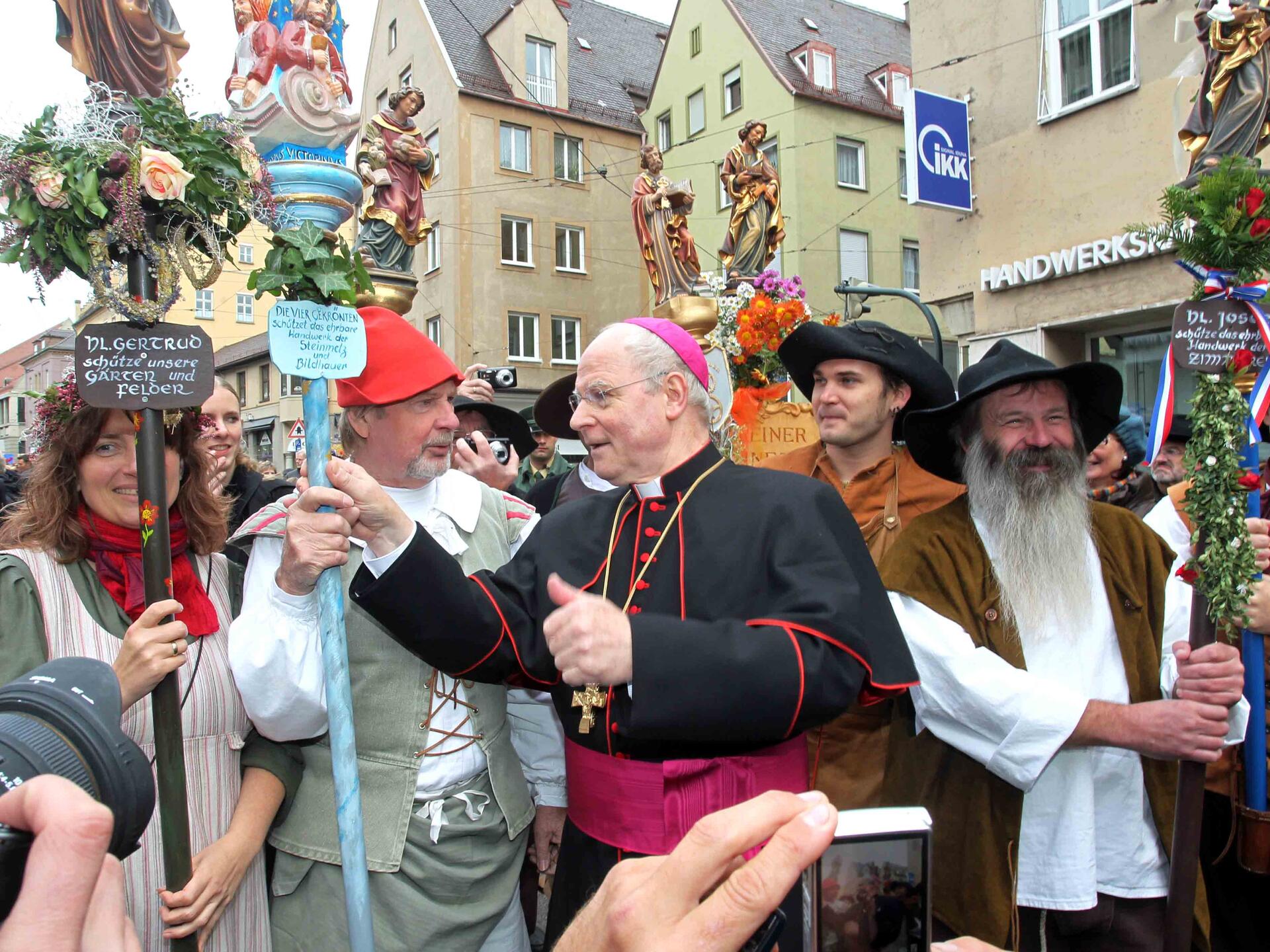 Nach dem Gottesdienst wurde Bischof Konrad von zahlreichen Gläubigen über einen Stationenweg zum Begegnungsfest ins Haus St. Ulrich begleitet. Kirchliche Gruppen, Verbände, Berufsstände und Gemeinschaften gestalteten diesen unter dem Motto „Volk Gottes unterwegs“. Ein Gedanke, der sein bischöfliches Wirken ihn in seiner Amtszeit stets leitete.