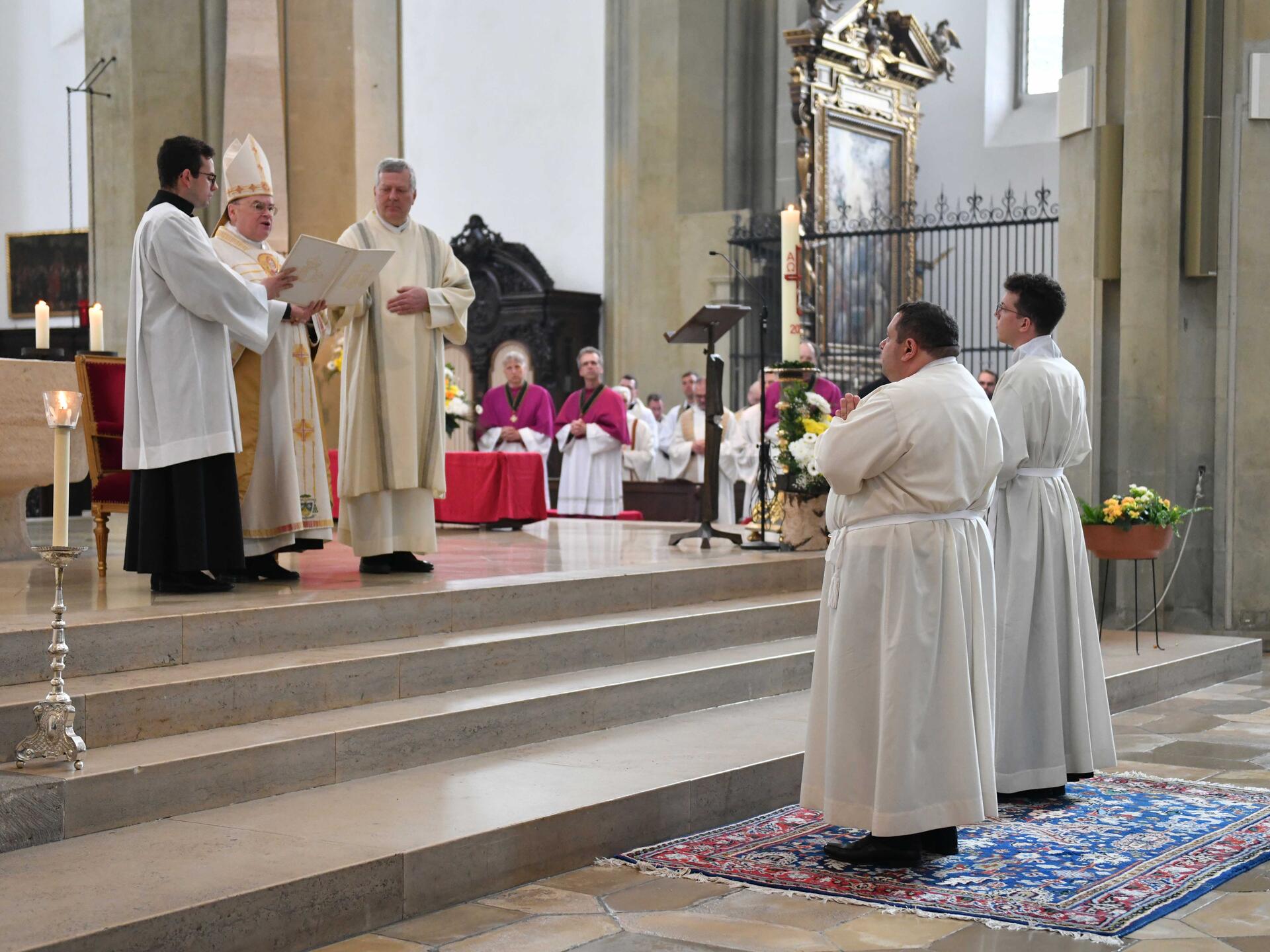 Nach der Predigt wurde in den ausdeutenden Riten zeichenhaft sichtbar, was den Diakonen zuteilwurde. Sie legten Stola und Dalmatik an und empfingen das Evangeliar aus den Händen des Bischofs.
