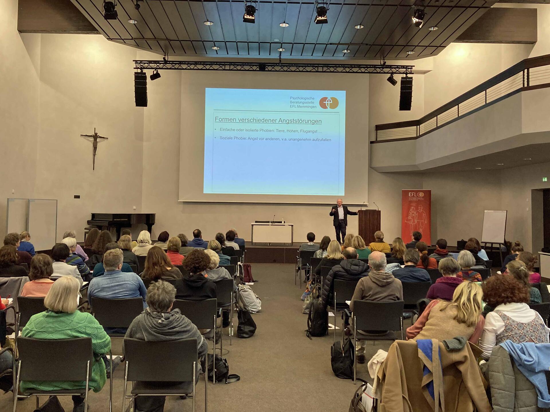 In seinem Fachvortrag „Angststörungen – Betroffene besser verstehen und beraten“ gab Theologe und Psychologischer Psychotherapeut Martin Uhl, der die EFL-Stelle Memmingen leitet, Einblicke in die Not der Betroffenen. Obwohl Angststörungen die häufigste psychische Erkrankung in Deutschland sind und jeder Fünfte mindestens einmal im Leben davon betroffen ist, seien sie ein verstecktes Leiden, das mit viel Scham verbunden ist. Doch was dagegen tun? Mithilfe systemischer und verhaltenstherapeutischer Techniken und der Arbeit an der inneren Konfliktdynamik können Berater/-innen ihre Klientinnen und Klienten dabei unterstützen, stufenweise in einen möglichst angstfreien Alltag zurückzufinden. Dazu lieferte der Referent eine Vielzahl an Interventionen und anschaulichen Fallbeispielen und ließ das Erlernte in Kleingruppen üben und festigen.