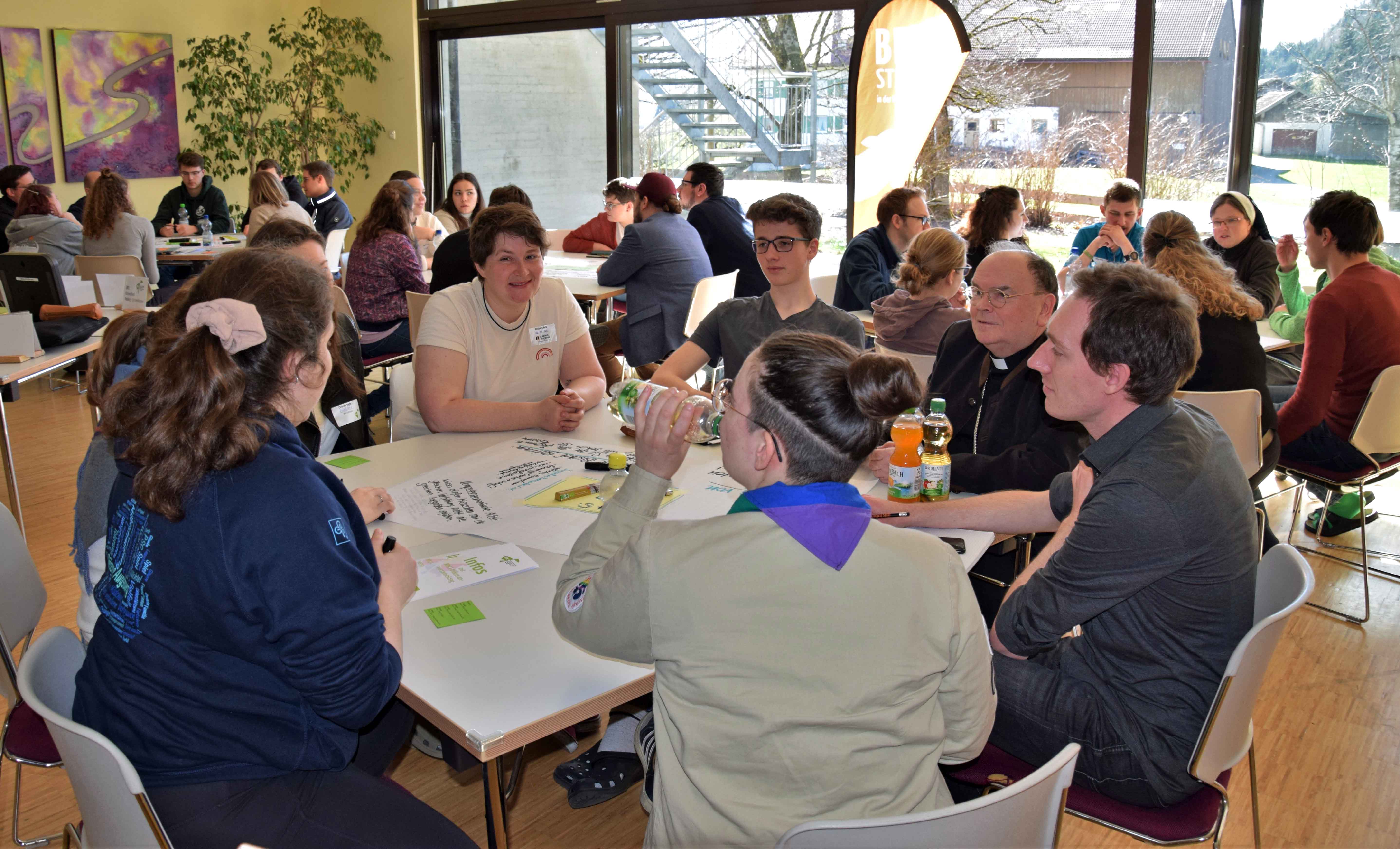 Auf der Tagesordnung der Versammlung des BDKJ, die an diesem Wochenende (17. – 19. März) stattfindet, hatte es zuvor eine Gesprächsrunde mit Bischof Bertram gegeben. An fünf runden Tischen wurden unter der Leitung des Diözesanvorstands verschiedene Themen behandelt. Die rund sechs Personen starken Teams aus den verschiedenen Jugendverbänden wechselten reihum die Tische und trugen in zehnminütigen Diskussionen ihre Erfahrungen zu den dort behandelten Bereichen zusammen. Der Bischof tauschte sich dabei rege mit den Teilnehmerinnen und Teilnehmern aus. Am Ende der Runde stellten die Verantwortlichen alle Ergebnisse des Austausches vor.
