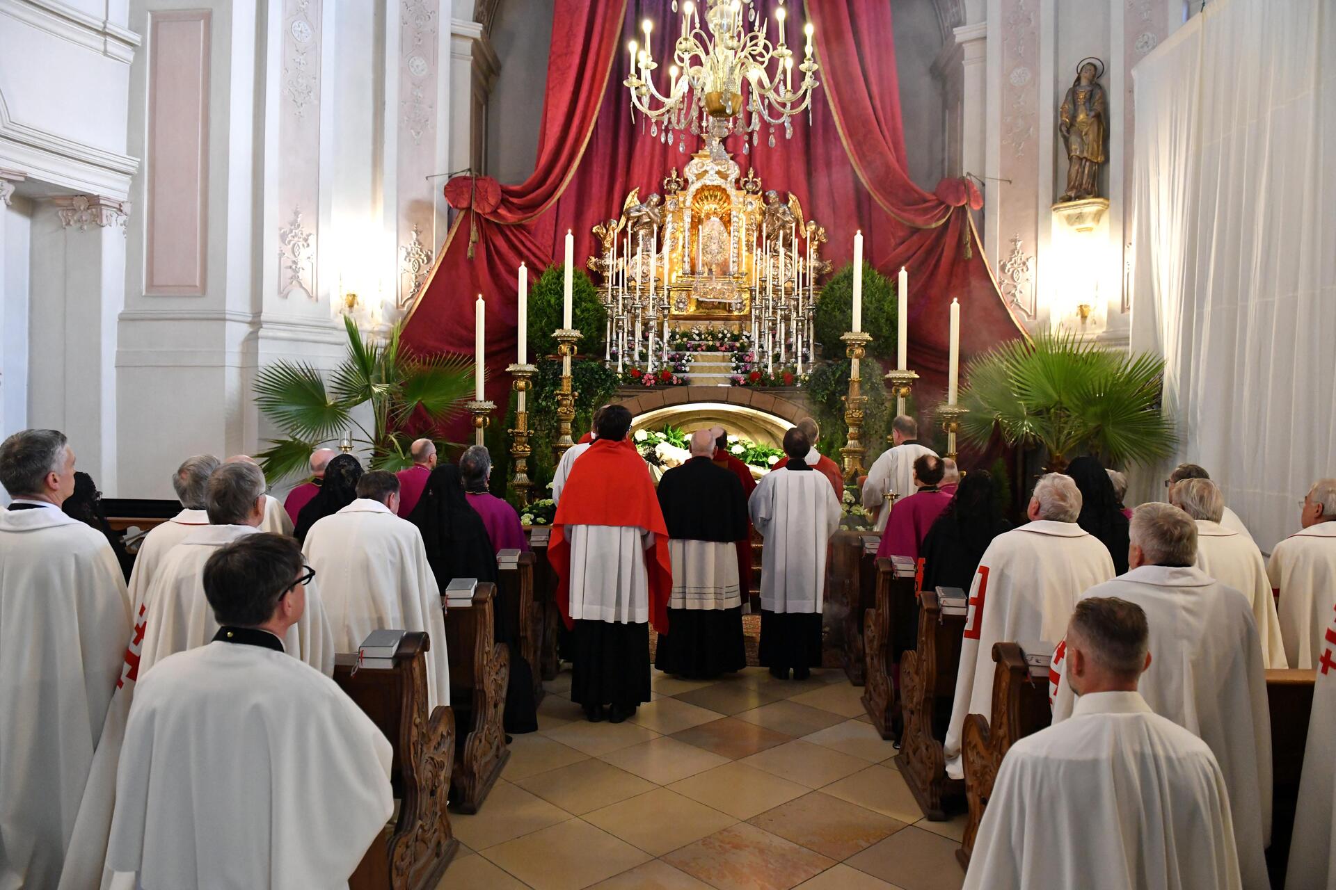 Nach der gesungenen Passion, den Großen Fürbitten, der Erhebung und Verehrung des Kreuzes sowie der Kommunionspendung zog Bischof Bertram mit der verschleierten Monstranz in seinen Händen zum Heiligen Grab, das traditionell in der Marienkapelle aufgebaut war und die Osterwoche hindurch zu besichtigen ist. Dort betete der Bischof gemeinsam mit den Weihbischöfen, dem Domkapitel, Priestern und Diakonen sowie den Rittern vom Heiligen Grab zu Jerusalem vor dem ausgesetzten Allerheiligsten.