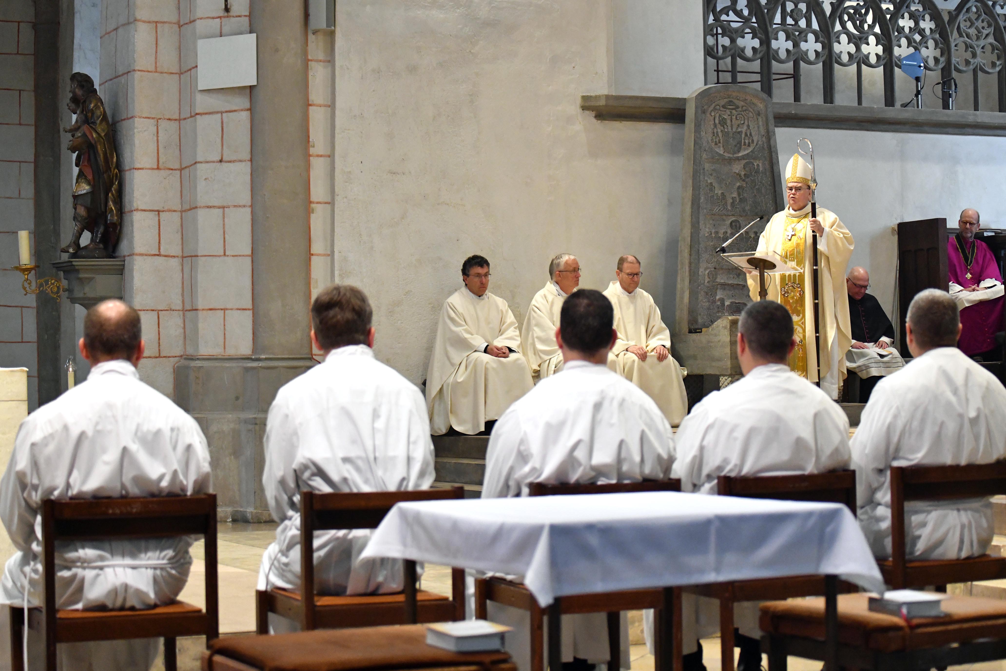 Damit der Dienst als Diakon gut gelingen kann, gründe dieser Lebensvollzug seit jeher in allen christlichen Kirchen auf den drei Säulen, die mit den griechischen Begriffen Liturgia (Gottesdienst), Martyria (Zeugnis) und eben Diakonia (Taten der Nächstenliebe) umschrieben werden. Bischof Bertram machte in diesem Zusammenhang deutlich: „Zwar dienen Diakone dem liturgischen Leben der Gemeinde, bekommen aber daraus auch jene spirituelle Stärkung, die notwendig ist, damit sie ihre Berufung vor Gott leben können.“ Eine Berufung, die sie fortan in der Verkündigung von Gottes Wort und in Taten für Menschen in Not lebten. „Das Evangelium versöhnt und heilt, es ist ein Angebot Gottes an alle – wirklich alle ohne Ausnahme. Deswegen ist es eine wertvolle Aufgabe, sich in seinen Dienst zu stellen“, gab er den Neu-Diakonen mit auf ihren Weg.