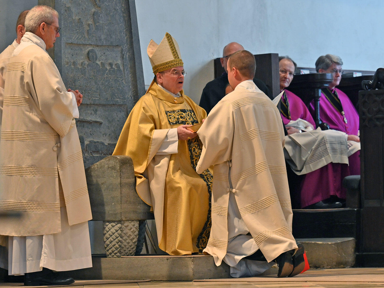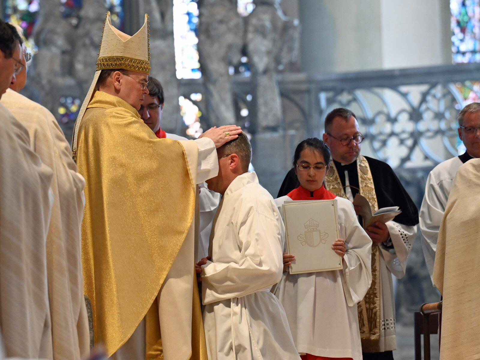 Schon im 2. Jahrhundert habe man Diakone als „Diener der Kirche Gottes“ bezeichnet, so der Bischof. Wenn er nun den Neugeweihten ein Evangeliar übergebe, lege er ihnen aber nicht nur Gottes Wort in die Hände, sondern vor allem ans Herz. Gottes Wort bestehe aber nicht aus „toten Buchstaben“, vielmehr sei es in Jesus ein lebendiger Mensch geworden, den es zu verkünden gelte. Bischof Bertram: „Gottes Wort ist keine menschliche Erfindung; es ist göttliches Erbe und Auftrag zugleich, der Kirche anvertraut. Das müssen wir ernst nehmen. Das Wort Gottes kann nicht nach eigenem Gutdünken verändert oder den Meinungen des jeweiligen ,Zeitgeistes‘ angepasst werden, weil es dann ,smarter‘ erscheint, leichter zu verdauen.“ Gleichzeitig gab er aber auch zu, dass die Botschaft Christi bisweilen eine „schwere Kost“ sei und die Geistlichen aus der Komfortzone heraushole. „Gottes Wort ist keine ,Wattebausch-Botschaft‘, gerade wenn wir unseren Blick auf Jesu Tod am Kreuz richten.“ Im Dienst der Verkündigung sollten die neuen Diakone vor allem „Echo Jesu Christi“