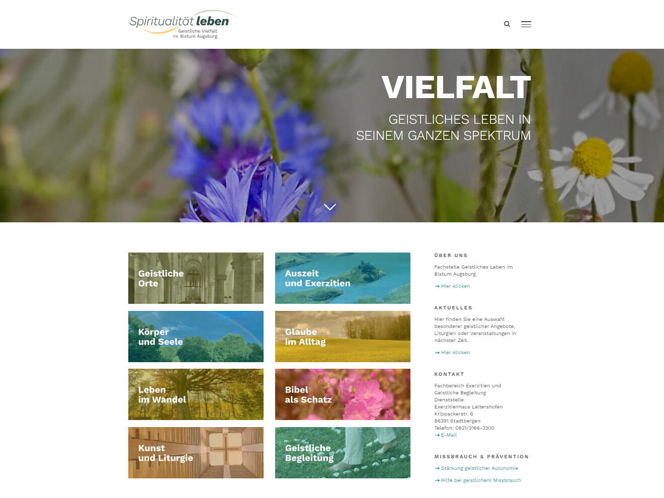 Die Vielfalt des spirituellen Lebens im Bistum Augsburg ist auf der neuen Homepage unter acht Rubriken zusammengefasst: Geistliche Orte – Auszeit und Exerzitien – Körper und Seele – Glaube im Alltag – Leben im Wandel – Bibel als Schatz - Kunst und Liturgie – Geistliche Begleitung. Unter letztgenannter Rubrik erfahren Interessierte, die ihren Glauben vertieft leben und dabei qualifiziert begleitet werden wollen, was sich hinter dieser Begleitung verbirgt und wer diese im Bistum anbietet.