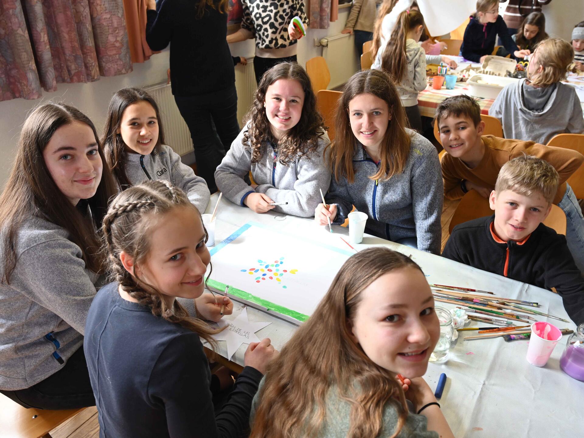 Nach dem Wortgottesdienst hatten die Ministrantinnen und Ministranten Gelegenheit, sich im Pfarrheim näher mit dem Förderprojekt in Chile auseinanderzusetzen. So gab ein Film zunächst Einblicke in das Förderzentrum und zeigte die Bewohnerinnen und Bewohner in ihrem täglichen Leben und Arbeiten. Danach gab es Stationen zum Basteln und Spielen.