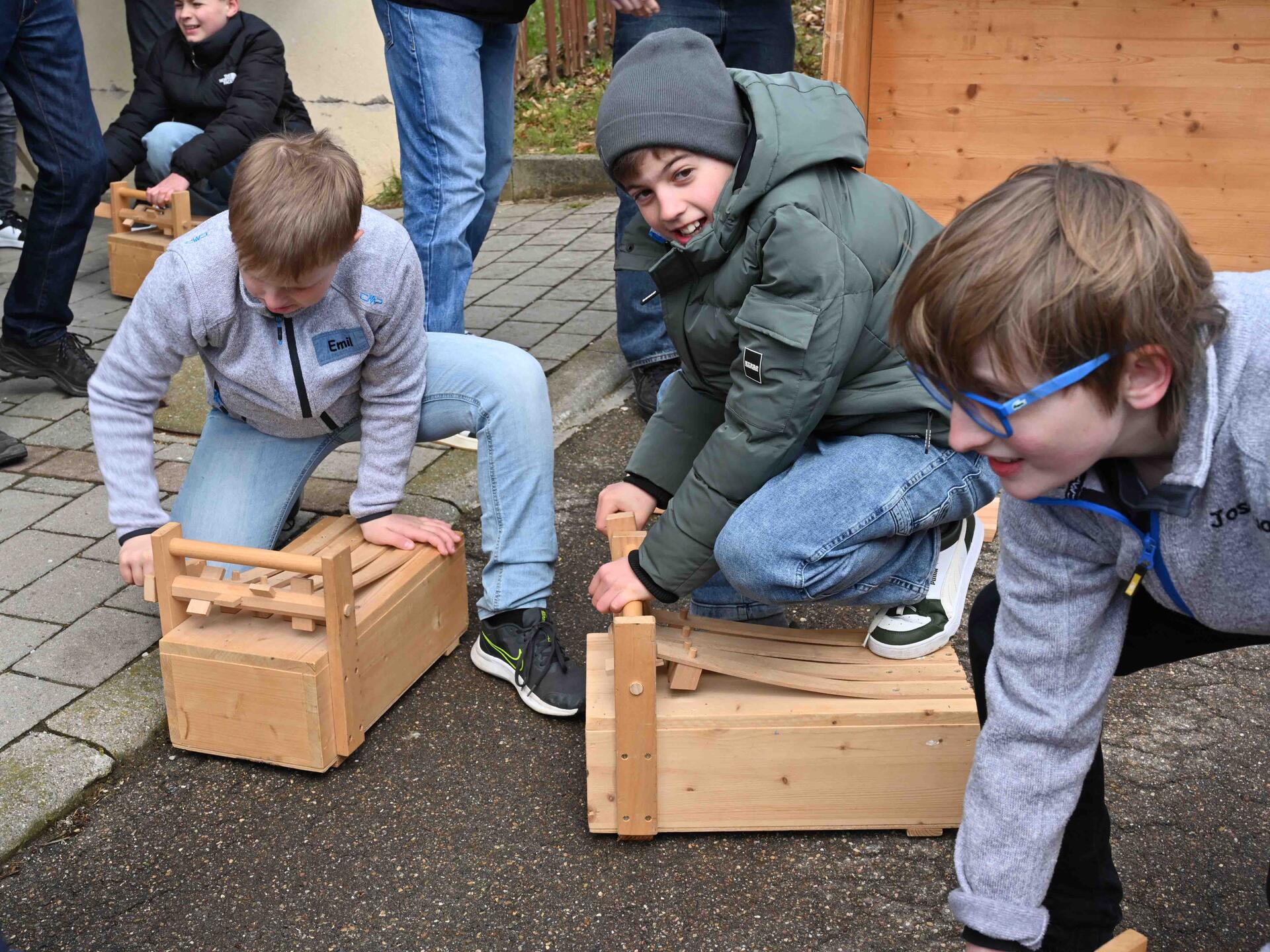 Um kurz vor 12 Uhr hatten die Minis dann aber nur noch für ihre Rätschen Kopf. Von kleinen Handinstrumenten, rollenden Fahrgeräten bis zur vermutlich größten Rätsche der Welt war der Kirchplatz mit sämtlichen, krachenden Holzinstrumenten gefüllt und dementsprechend laut wurde es schließlich auch. Mit bischöflicher Unterstützung galt es um Punkt zwölf Uhr nur noch ein Motto umzusetzen: „Krach machen, um andere aufzurütteln“.