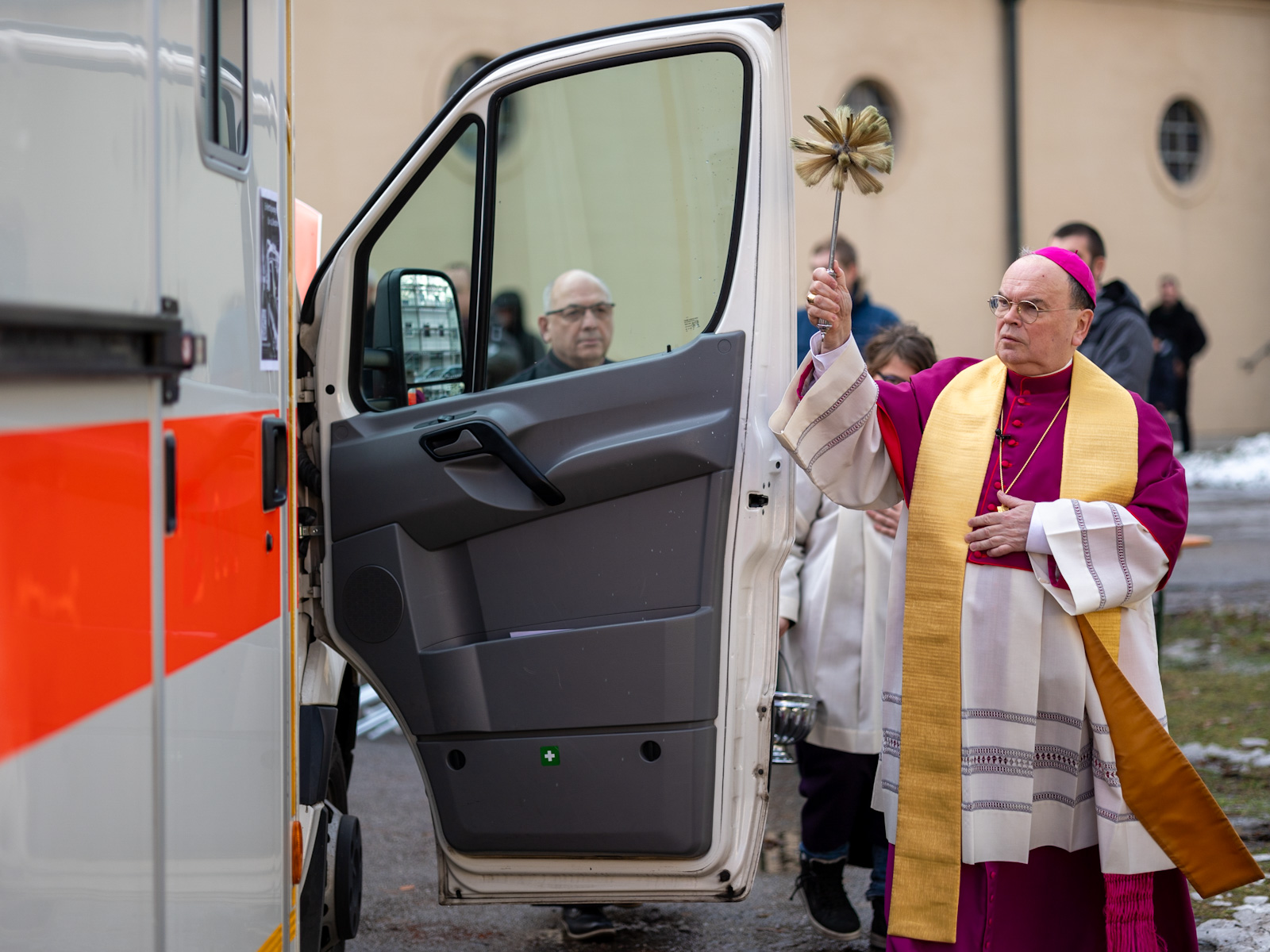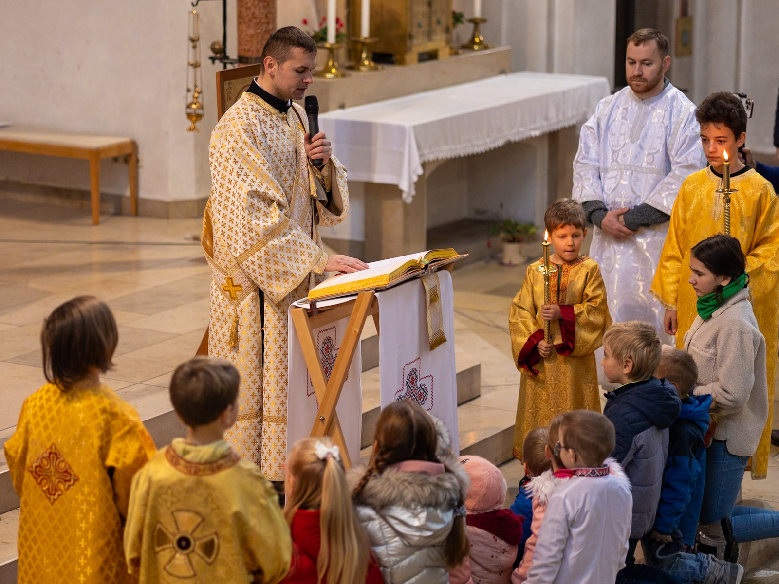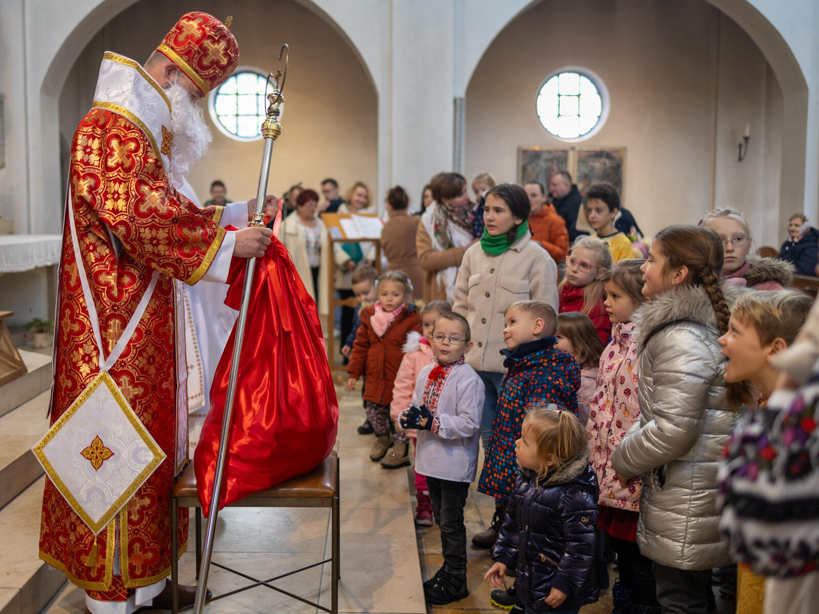 Bischof Bertram zelebrierte den feierlichen Gottesdienst nach dem byzantinischen Ritus gemeinsam mit Andrij Pizo und Bohdan Sabalo, die für die ukrainische griechisch-katholische Kirche im Gebiet des Bistums Augsburg als Pfarrer tätig sind. Zudem feierten der Leiter des Exerzitienhauses St. Paulus in Leitershofen Dr. Christian Hartl und der als Kaplan in der Pfarreiengemeinschaft Kriegshaber tätige Dr. Hilary Ubah den Gottesdienst mit; Dr. Hartl war noch aus seiner Zeit als Geschäftsführer des kirchlichen Osteuropa-Hilfswerks Renovabis mit der Ukraine eng vertraut, während Dr. Ubah seinerzeit gemeinsam mit Pfarrer Sabalo den Deutschkurs absolviert hatte. Die Liturgie wurde dabei auf ukrainisch und deutsch gefeiert. Zuvor hatte der Bischof noch einen Krankenwagen gesegnet, der von der ukrainisch-katholischen Gemeinde, dem Ukrainischen Verein Augsburg sowie dem deutsch-ukrainischen Verein „Wir sind hier“ gespendet wurde und demnächst seinen Dienst als Verwundetentransport an der Front bei Saporischschja aufnehmen soll. Im Anschluss an die Gottesdienstfeier gab es für die zahlreich anwesenden Kinder noch eine freudige Überraschung, als der heilige Nikolaus sie mit süßen Geschenken bedachte.