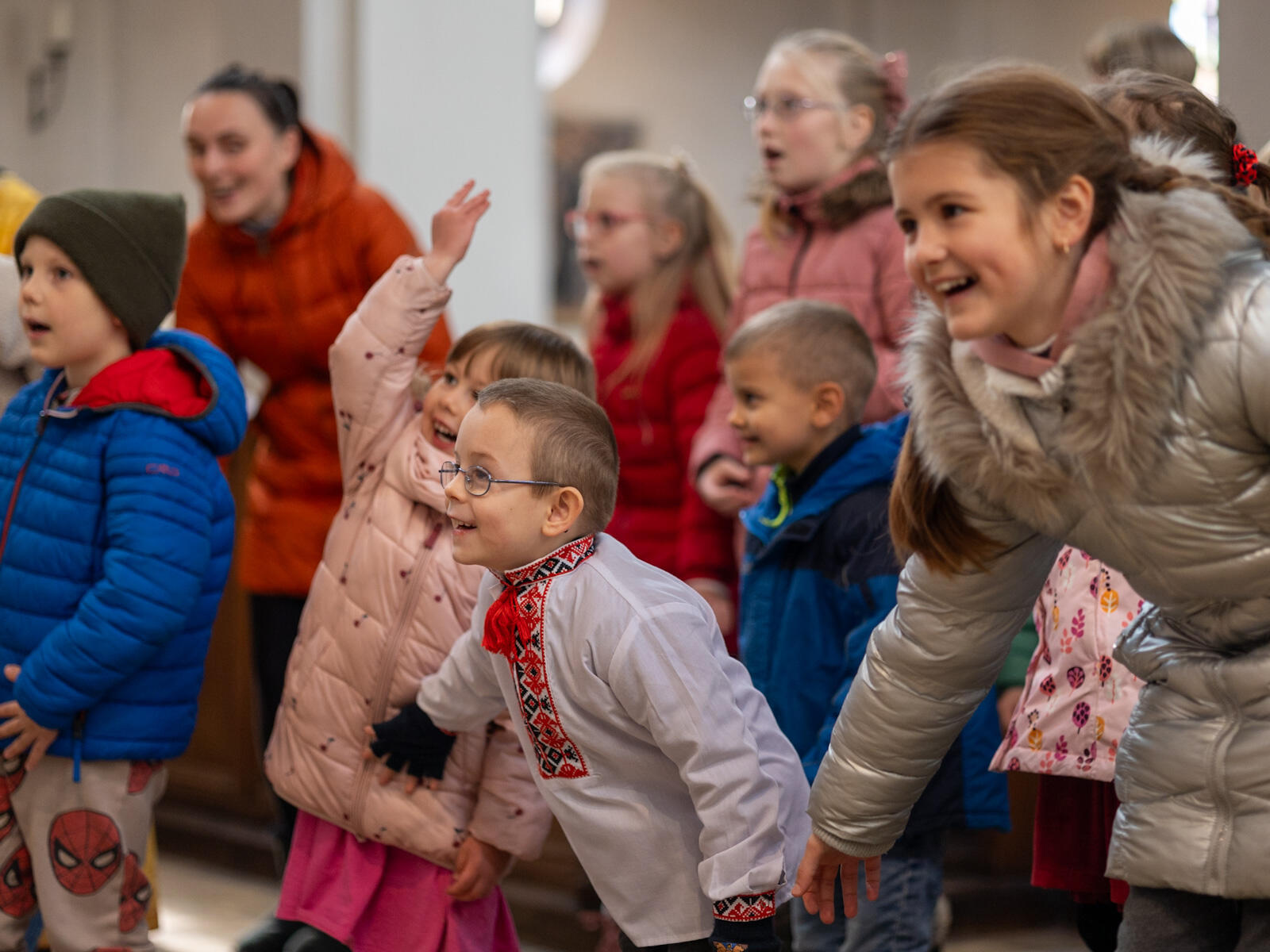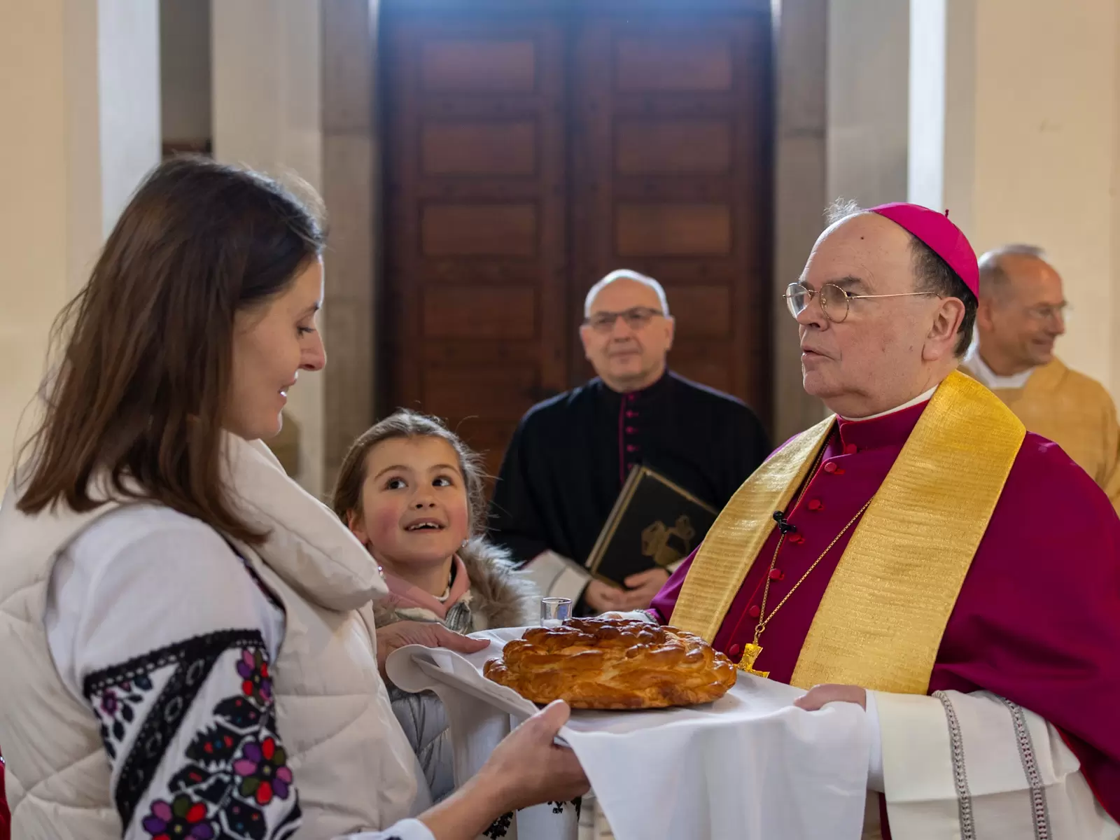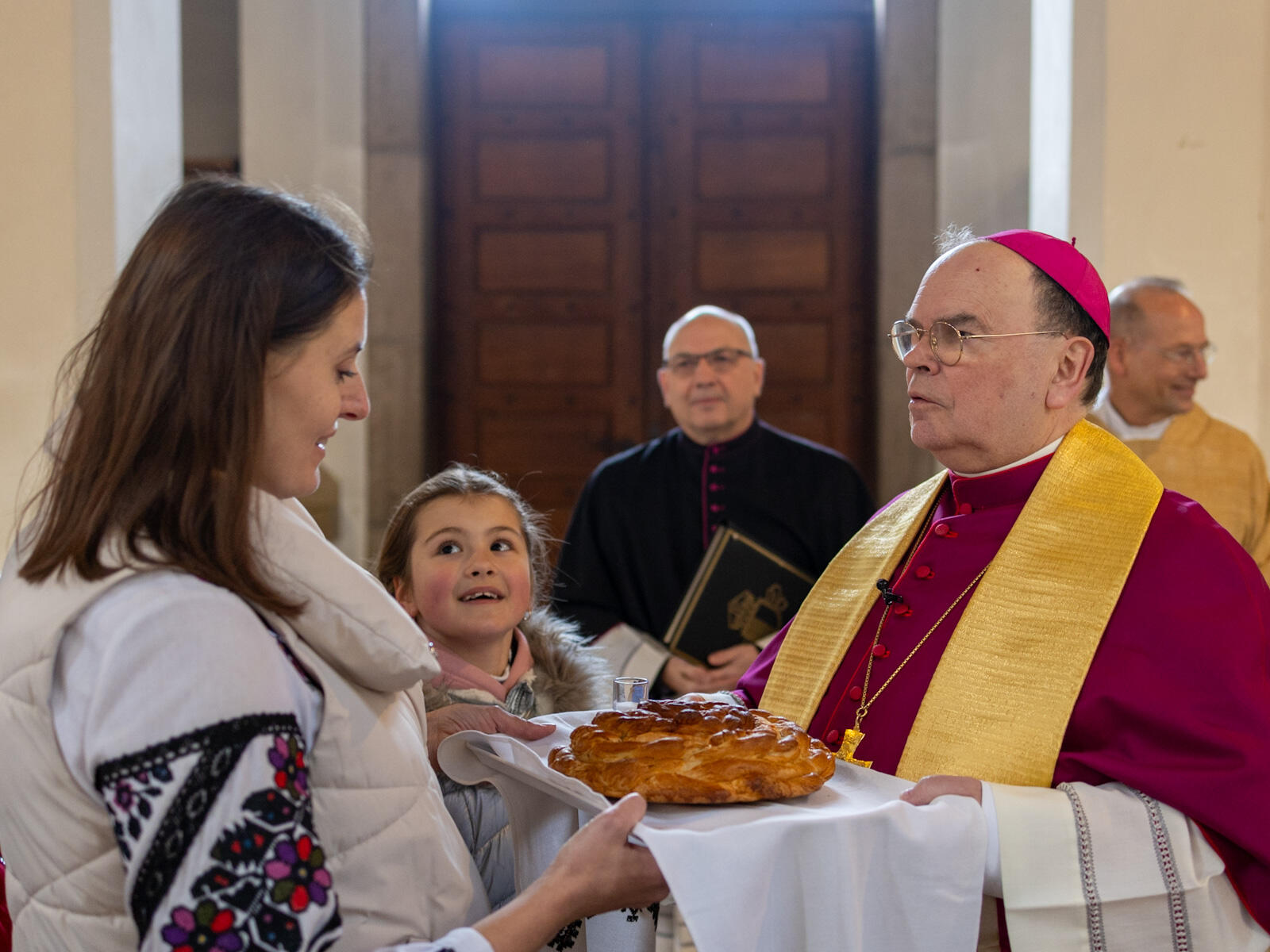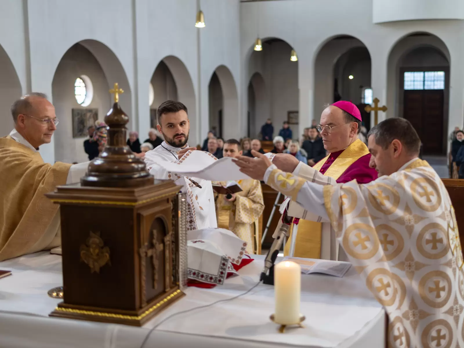 Bischof Bertram zelebrierte den feierlichen Gottesdienst nach dem byzantinischen Ritus gemeinsam mit Andrij Pizo und Bohdan Sabalo, die für die ukrainische griechisch-katholische Kirche im Gebiet des Bistums Augsburg als Pfarrer tätig sind. Zudem feierten der Leiter des Exerzitienhauses St. Paulus in Leitershofen Dr. Christian Hartl und der als Kaplan in der Pfarreiengemeinschaft Kriegshaber tätige Dr. Hilary Ubah den Gottesdienst mit; Dr. Hartl war noch aus seiner Zeit als Geschäftsführer des kirchlichen Osteuropa-Hilfswerks Renovabis mit der Ukraine eng vertraut, während Dr. Ubah seinerzeit gemeinsam mit Pfarrer Sabalo den Deutschkurs absolviert hatte. Die Liturgie wurde dabei auf ukrainisch und deutsch gefeiert. Zuvor hatte der Bischof noch einen Krankenwagen gesegnet, der von der ukrainisch-katholischen Gemeinde, dem Ukrainischen Verein Augsburg sowie dem deutsch-ukrainischen Verein „Wir sind hier“ gespendet wurde und demnächst seinen Dienst als Verwundetentransport an der Front bei Saporischschja aufnehmen soll. Im Anschluss an die Gottesdienstfeier gab es für die zahlreich anwesenden Kinder noch eine freudige Überraschung, als der heilige Nikolaus sie mit süßen Geschenken bedachte.