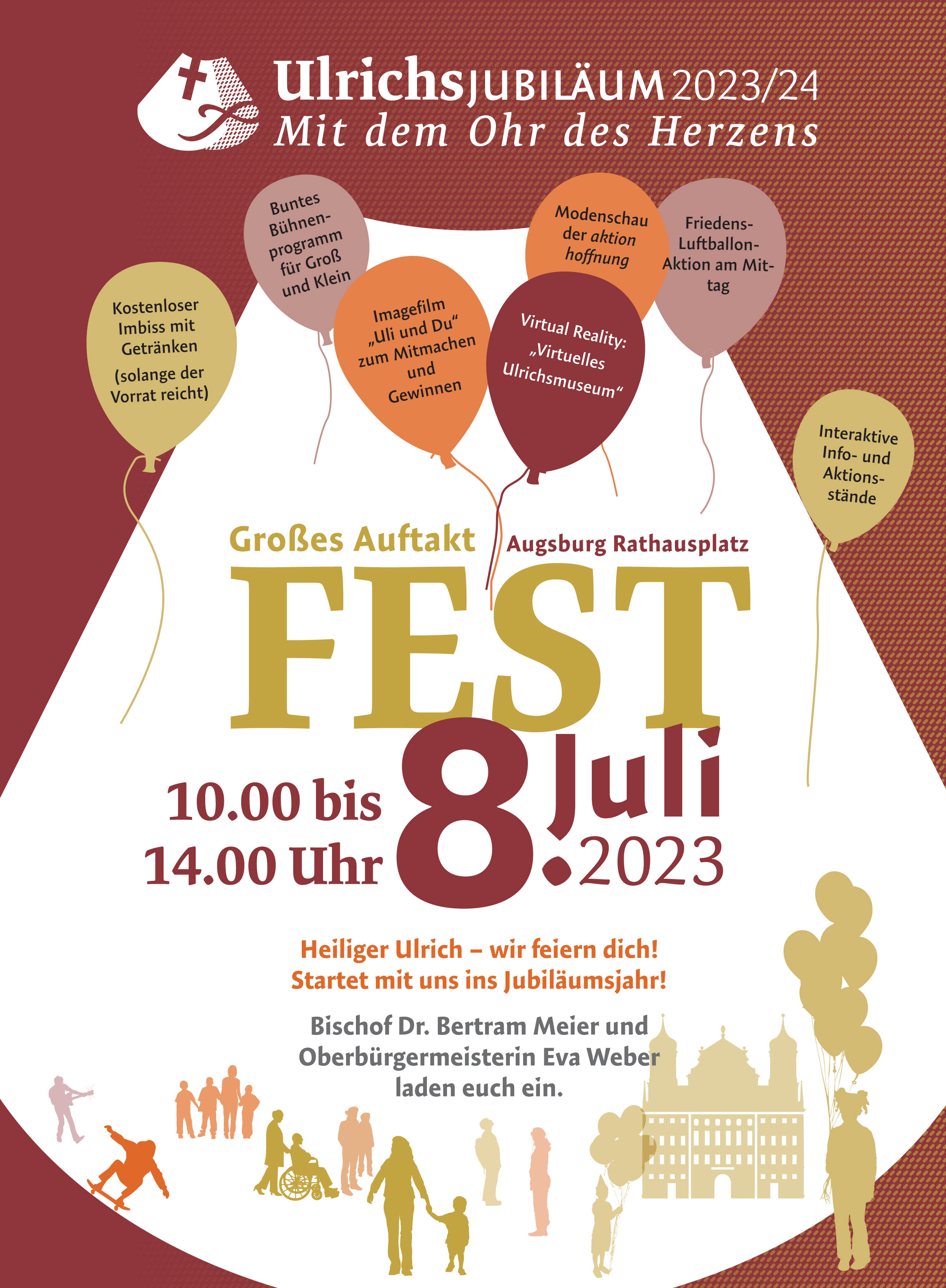 Für die Stadtgesellschaft wird das Ulrichsjubiläum das erste Mal weithin sichtbar werden am Samstag, 8. Juli. Das Bistum und die Stadt Augsburg laden gemeinsam ein zu einem großen Auftaktfest auf dem Augsburger Rathausplatz, das um 10 Uhr beginnen und bis 14 Uhr gehen soll. Hier präsentiert sich das Bistum mit zahlreichen Ständen, es gibt ein buntes Bühnenprogramm mit viel Musik und um 12 Uhr dürfen Kinder ihre Bitten an den heiligen Ulrich mit Luftballons in den Himmel steigen lassen. Bischof Bertram: „Mir ist wichtig, dass wir das Ulrichsjubiläum nicht nur im ‚inner circle‘ feiern, sondern dass wir nach draußen gehen. Das Evangelium gehört in die Stadt.“