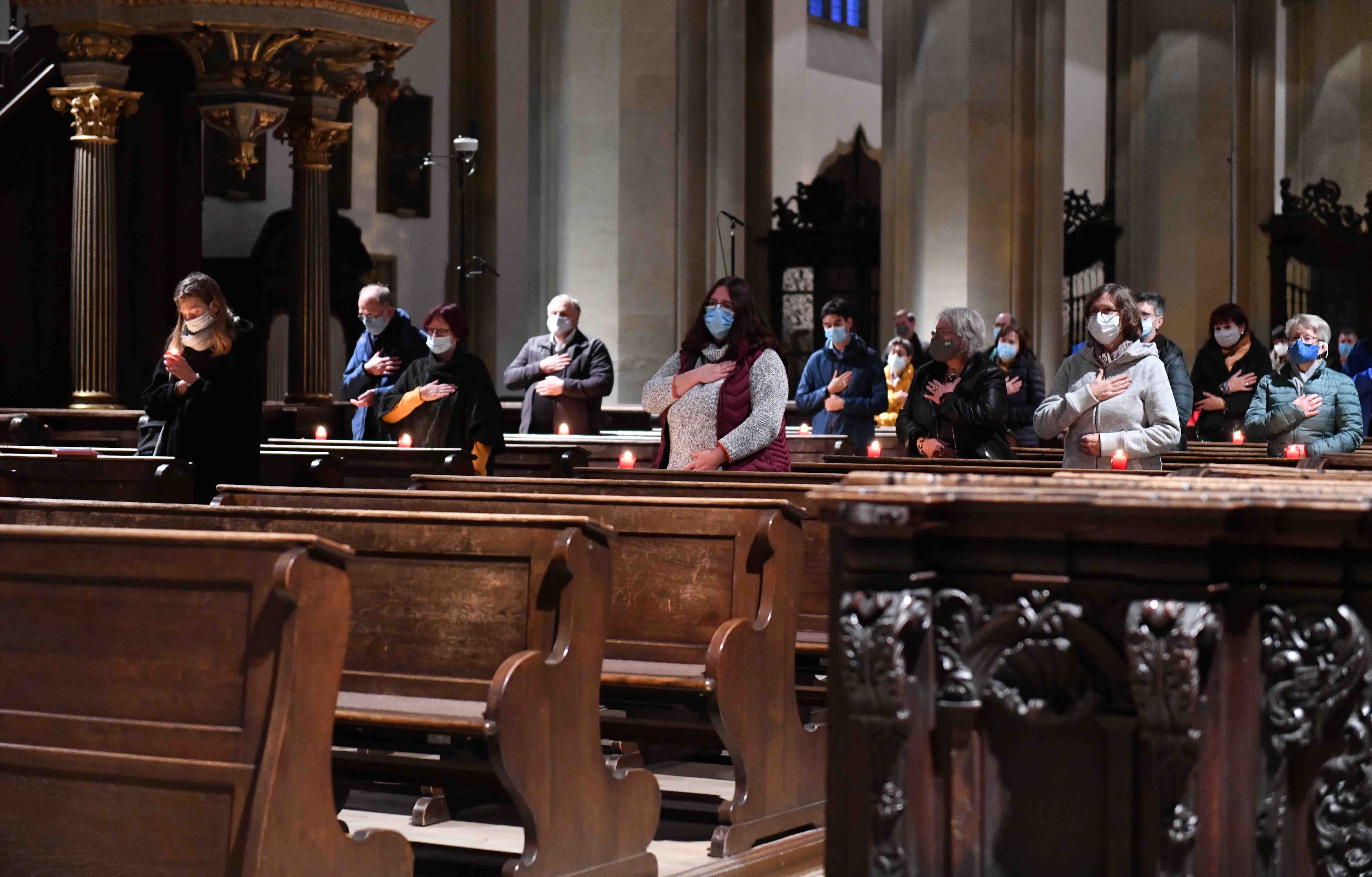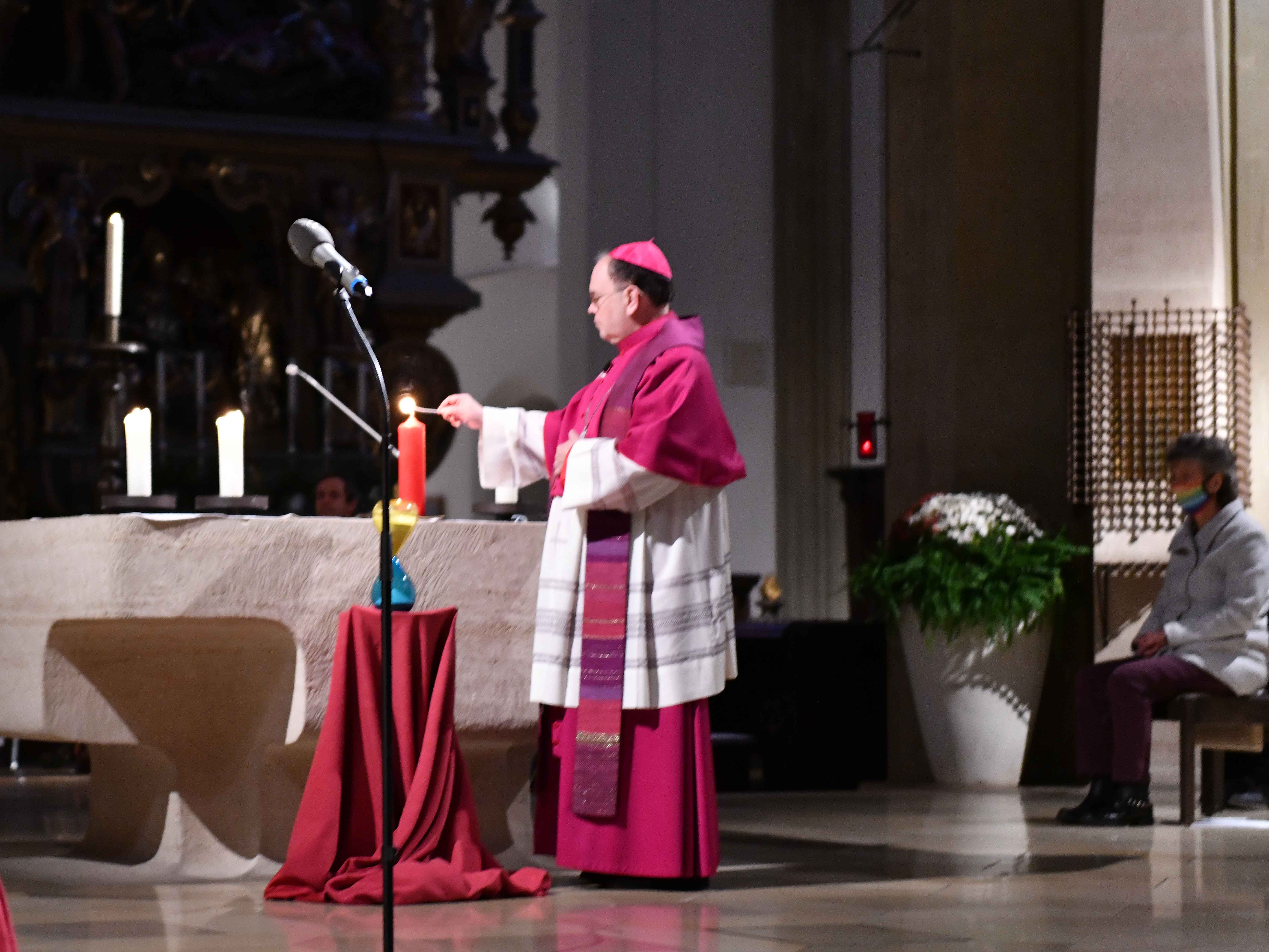 Mit dem Läuten der Totenglocke entzündete Bischof Bertram eine Kerze stellvertretend für alle Verstorbenen in der Corona-Zeit. Bereits zu Beginn der Gedenkfeier standen Kerzen für alle Mitfeiernden bereit, die entflammt und mit in die Bank genommen werden konnten.