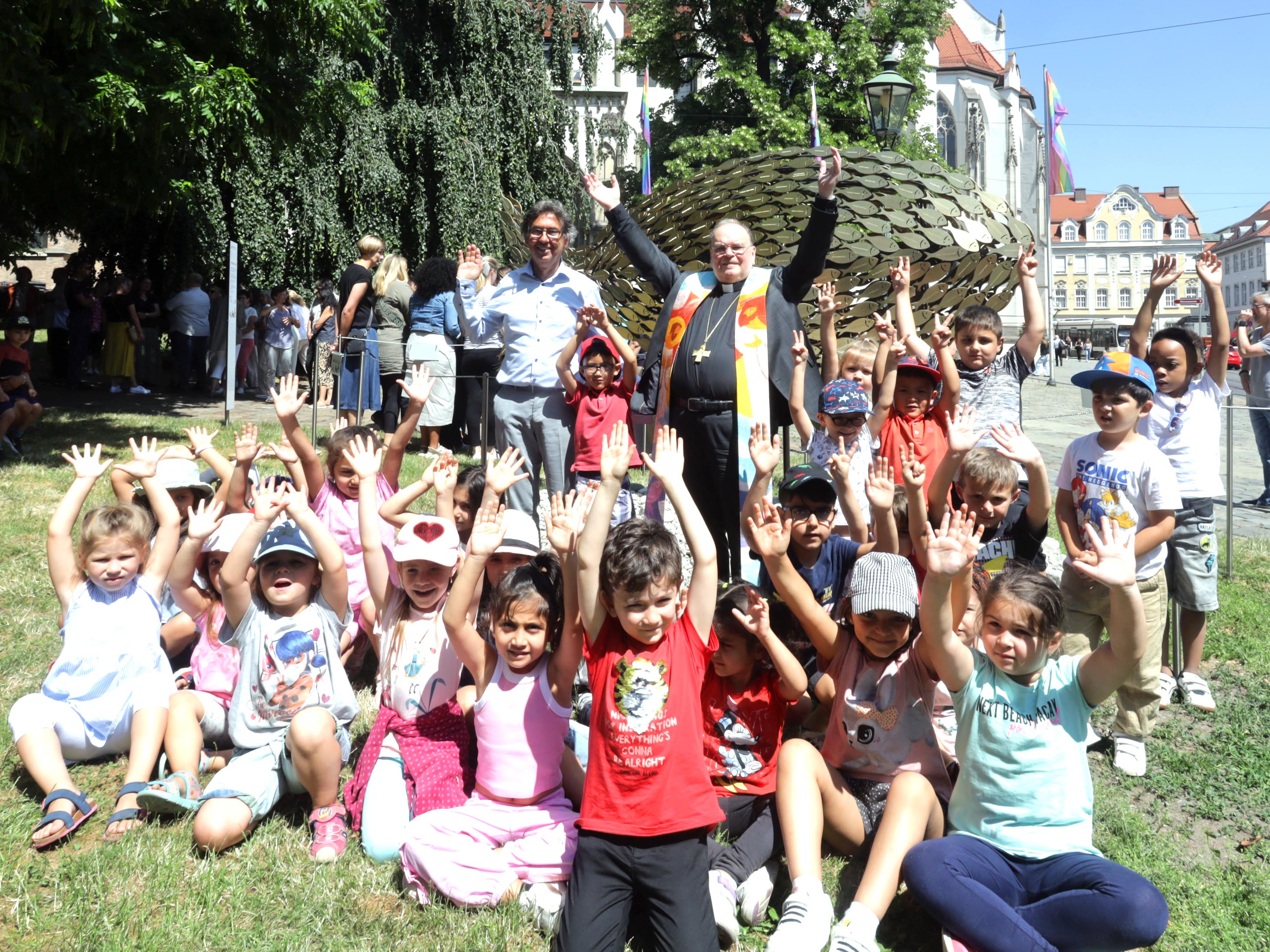 „Wir sind alles Fische in Gottes Schwarm“, mit diesem fröhlichen Lied umrahmten die Kinder der Kindertagesstätte Maria Stern einen ganz besonderen Festakt: Vor dem Augsburger Dom enthüllten Sie gemeinsam mit Bischof Dr. Bertram Meier eine von Martin Knöferl geschaffene Fischskulptur. Sie ist der Beitrag des KiTa-Zentrums St. Simpert zum am Montag beginnenden Ulrichsjubiläum.