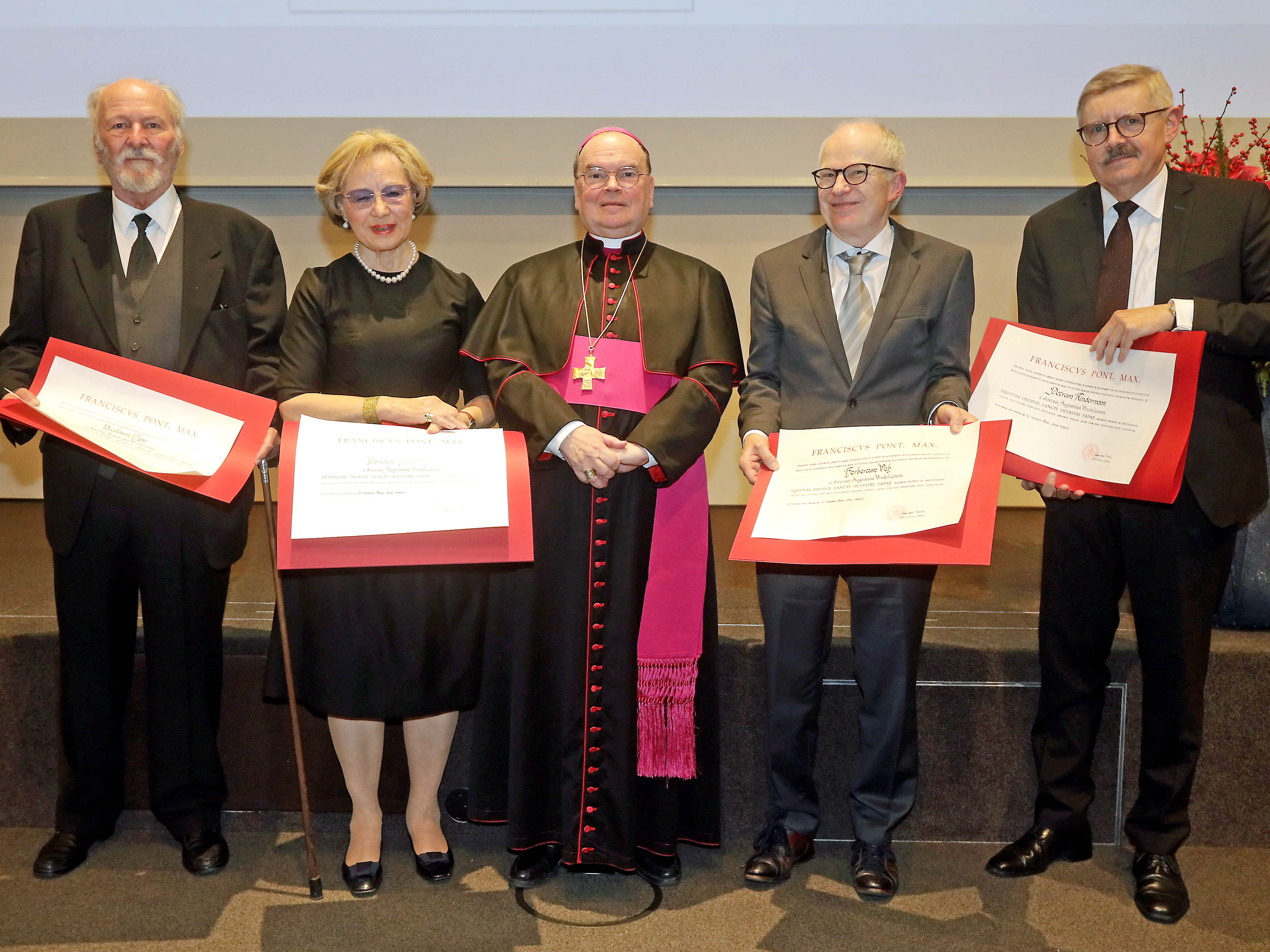 (von links): Prof. Dr. Claus Hipp, Hettenshausen (Komtur), Doris Hallermayer, Augsburg (Dame), Bischof Bertram, Dr. Herbert Veh, Augsburg (Ritter), Peter Kindermann, Augsburg (Ritter).