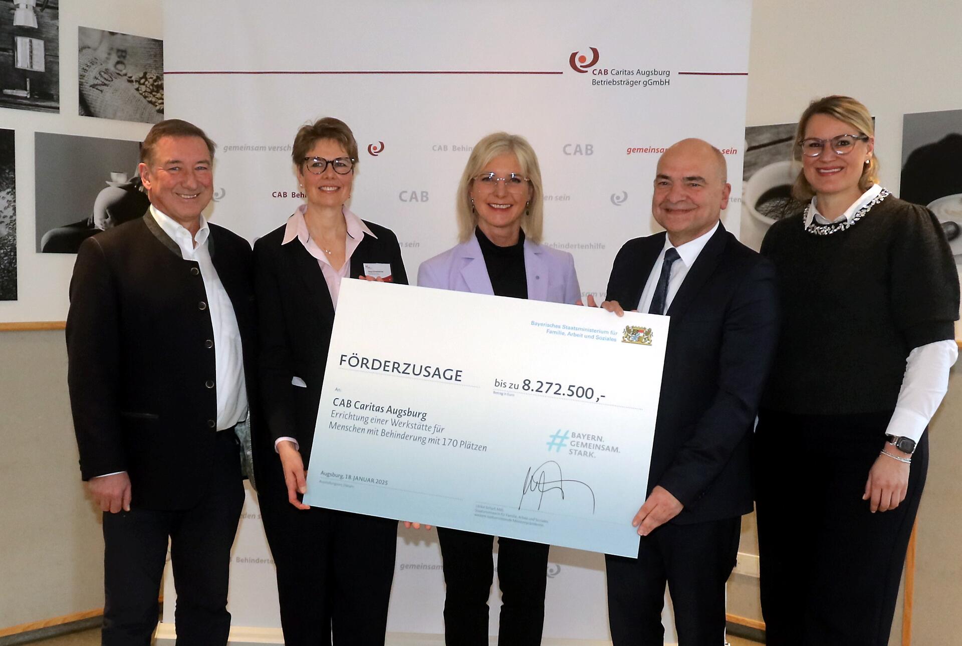 Bayerns Sozialministerin Ulrike Scharf übergab den Förderbescheid am Samstag an Diözesan-Caritasdirektor Markus Müller und Sonja Schoenberner, Geschäftsführerin der CAB Caritas Augsburg Betriebsträger gGmbH, der Trägerin der neuen Werkstätten. In ihrer Ansprache hob Ulrike Scharf die Bedeutung beruflicher Inklusion hervor: „Inklusion stärkt den Zusammenhalt in unserer Gesellschaft.“ Sie setze sich deshalb aus Überzeugung für ein Bayern ein, „in dem für alle Menschen – unabhängig ob mit oder ohne Behinderung – Teilhabe und ein selbstbestimmtes Leben möglich sind.“ Die berufliche Inklusion sei dabei ein wichtiger Schlüssel.