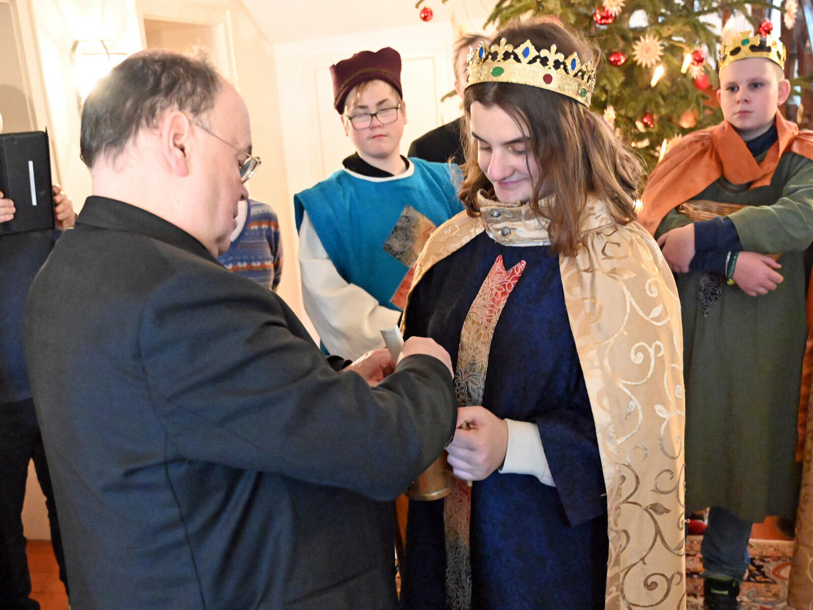 Stolz nahm eine Königin die Spende des Bischofs entgegen. Die Gruppe sammelt in diesem Jahr für eine Förderschule in Ulaanbaatar, der Hauptstadt der Mongolei. Dort werden Kinder mit geistiger oder körperlicher Behinderung gemeinsam mit Kindern ohne Einschränkung unterrichtet, erhalten Therapien und werden den Tag über betreut.