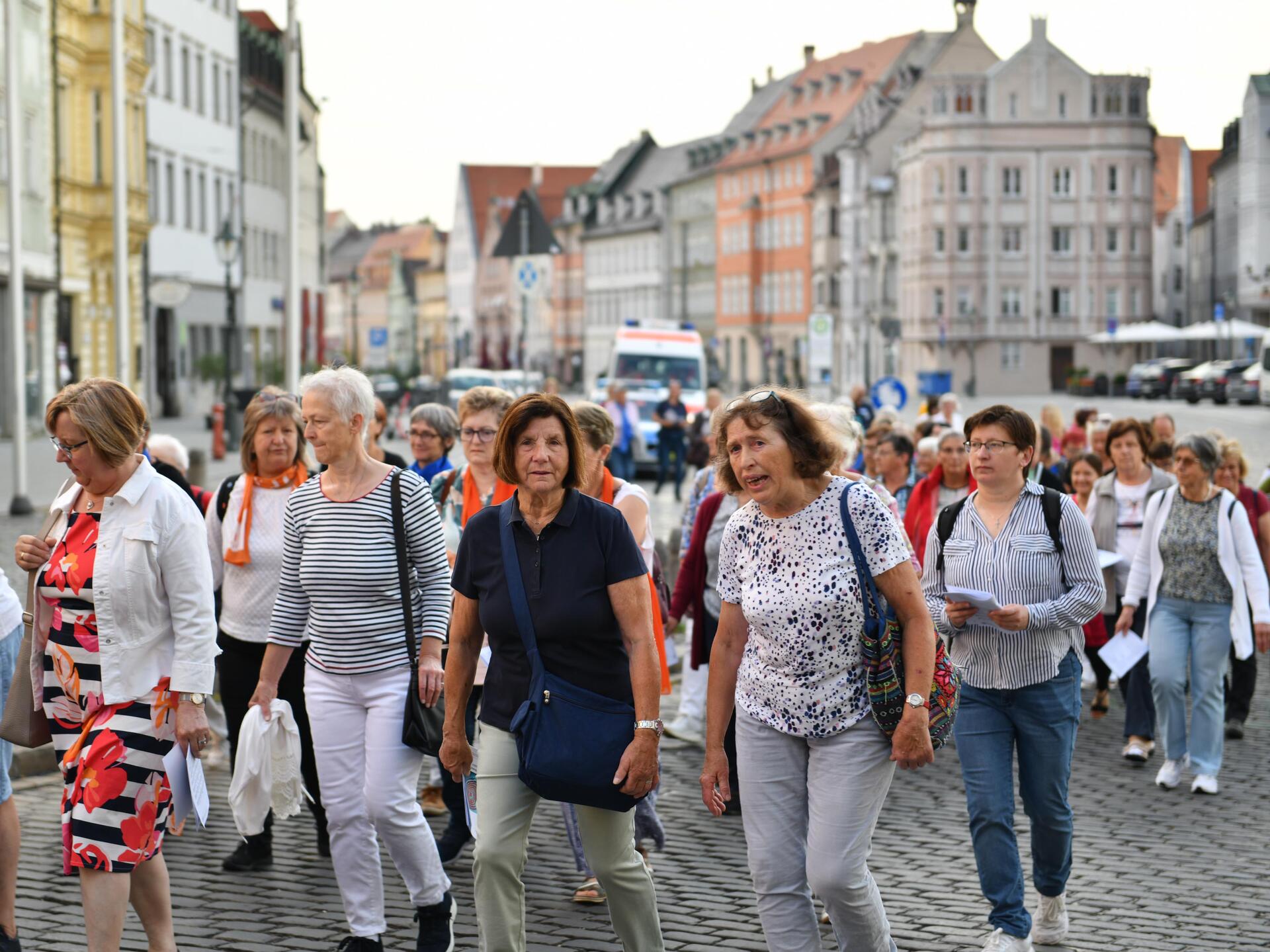 Vereint im Gebet um den Frieden haben sich an diesem Mittwoch knapp 300 Frauen in den frühen Morgenstunden auf den Weg vom Dom über die Maxstraße bis hin zur Basilika St. Ulrich und Afra gemacht. Mit dem Wegkreuz und blauen Verbandsfahnen voraus gingen sie singend und betend den rund eineinhalb Kilometer langen Wallfahrtsweg. Nach einem feierlichen Empfang mit Glocken und Orgelklängen rundete ein Pontifikalamt mit Bischof Dr. Bertram Meier die traditionelle Frauenwallfahrt in der Ulrichswoche ab.