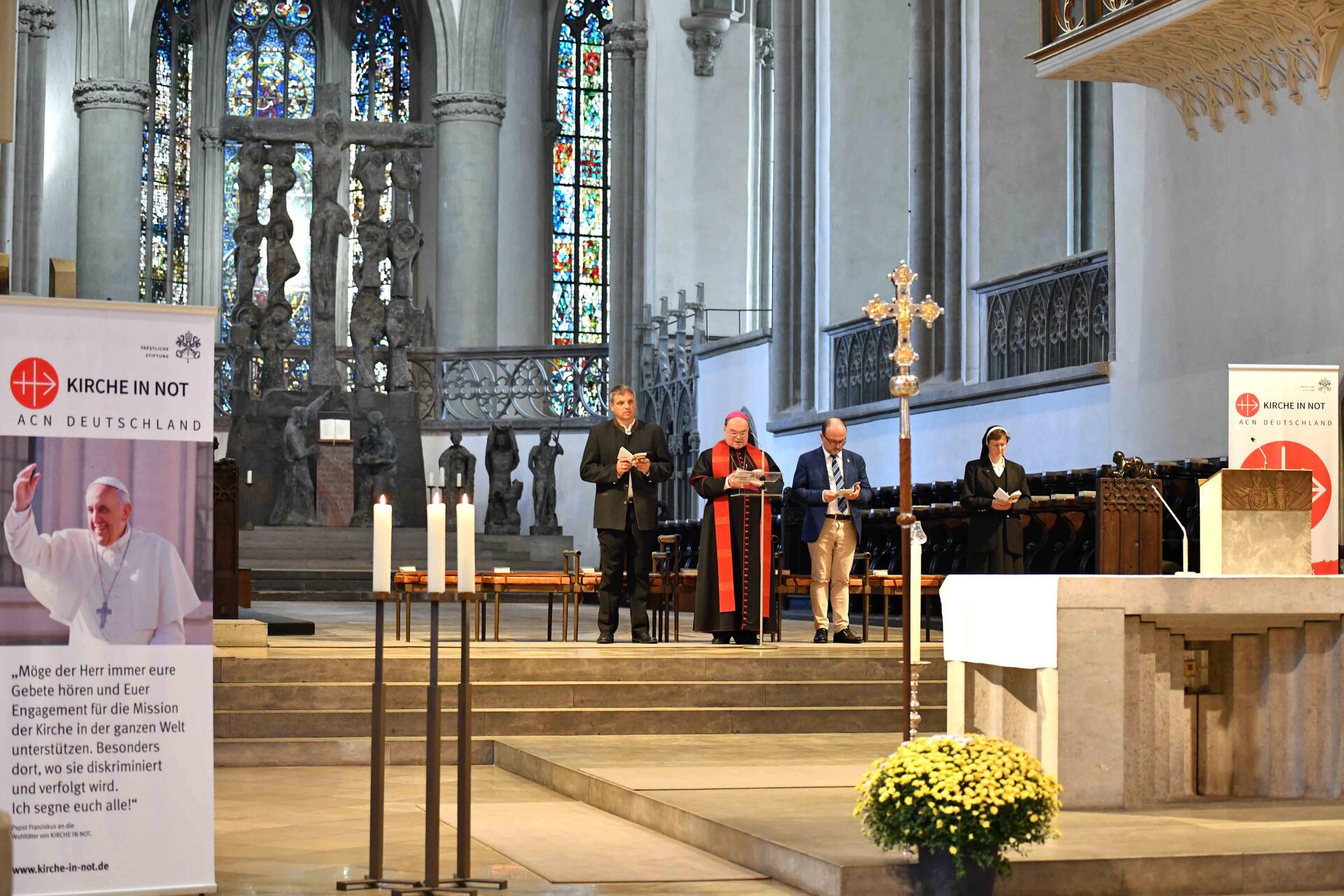 Ein sichtbares Zeichen der Verbundenheit und Solidarität mit den verfolgten Christen weltweit setzten beim Solidaritätstag die Beterinnen und Beter, die im Hohen Dom, daheim oder von unterwegs den live von Radio Horeb übertragenen Kreuzweg Jesu von Station zu Station mitgingen. Bischof Bertram lenkte vor dem Betrachten der einzelnen Stationen den Blick auf die Botschaft, die heute noch von Jesu Leiden ausgeht: „Obgleich allmächtig verzichtet der Sohn Gottes darauf, seine Peiniger mit Vollmacht in die Schranken zu weisen. Sein Heilsplan ist ein anderer. Denn Gewalt kann nicht durch noch größere Gewalt besiegt werden, nur durch Vergebung und Liebe.“