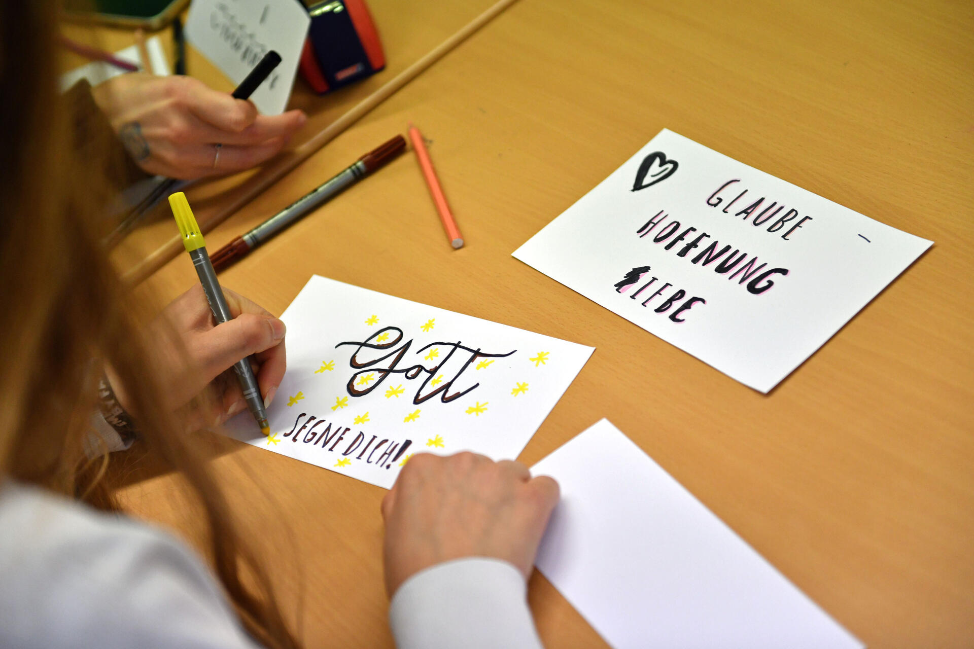 Die Schuluhr zeigt 15.45 Uhr, nach und nach füllt sich das Klassenzimmer mit dem Schild 8 RA links an der Wand neben der Tür. Die zweite Workshop-Runde beginnt. Einer stand in diesem Raum besonders im Fokus des Interesses. Fast drei Dutzend Teilnehmer nutzten die Gelegenheit, ihren Bischof mit Fragen über den Glauben, die Kirche und das Leben zu löchern. Dabei fühlten sie ihm in Sachen Berufung und Zölibat, Ökumene und Liturgie ebenso auf den Zahn wie zum Thema bischöfliche Freizeitgestaltung. Bischof Bertram kurzum: der Besuch auf dem Christkindlesmarkt mit Glühwein und Bratwurst darf es genauso mal sein wie ein gutes Essen oder eine Alpaka-Wanderung. Allerdings nur wenn es der prallgefüllte Terminkalender erlaube.