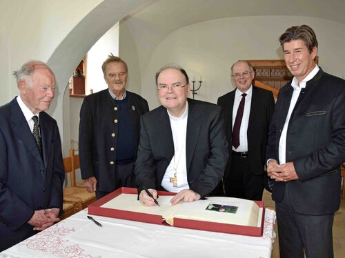 Bischof Bertram trug sich anschließend im Pfarrhaus in das Goldene Buch des Marktes Oberstdorf ein. Im Beisein von Pfarrer Maurus B. Mayer, dem Ruhestandsgeistlichen Franz Neumair, Altbürgermeister Eduard Geyer, dem Gästeseelsorger Pfarrer Bruno Koppitz und Bürgermeister King schrieb er die Worte nieder: „Möge die neue Glocke von St. Johann nicht nur die Klangkrone des Geläutes sein, sondern ihrem Namen alle Ehre machen: Botschafterin des Friedens sein für Oberstdorf und seine Gäste!“