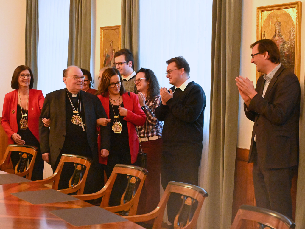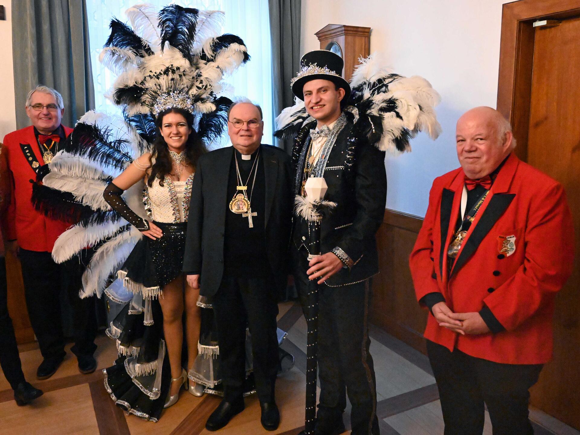 Wie jedes Jahr konnte Bischof Bertram wieder die Mitglieder der Augsburger Faschingsgesellschaft im Bischofshaus begrüßen. An der Spitze des großen Teams stehen neben dem Präsidium im diesjährigen Fasching das Prinzenpaar Juliane I. (Girscht) und Marcel I. (Koller). Beide hatten als Geschenk den neuen Faschingsorden dabei.