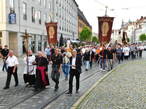 Schon deutlich vor halb acht formierte sich nach und nach bei immer noch hochsommerlichen Temperaturen im Schatten des Doms der Prozessionszug, an dessen Spitze sich Weihbischof Anton und Diözesan-Männerseelsorger Diakon Gerhard Kahl setzten. Wie in jedem Jahr mischten sich die Fahnen und Standarten der kirchlichen Verbände, örtlichen Vereine, Feuerwehren und religiösen Vereinigungen darunter. Mit dem Glockenschlag um 19.30 Uhr wurden die Teilnehmer begrüßt und setzten sich kurz darauf in Richtung Ulrichsbasilika in Bewegung. Hunderte Männer zogen vorbei am Rathausplatz, gemustert und gefilmt von den Passanten, die immer noch in Europameisterschafts-Flair gehüllte Prachtstraße entlang und dem Schrein des Bistumspatrons entgegen. Kurz vor acht zogen die Fahnenabordnungen samt den Wallfahrern unter den Klängen von Ulrichsbläsern und Orgel durch das Hauptschiff vor den Altar und senkten ihre Fahnen vor dem Ulrichsschrein.