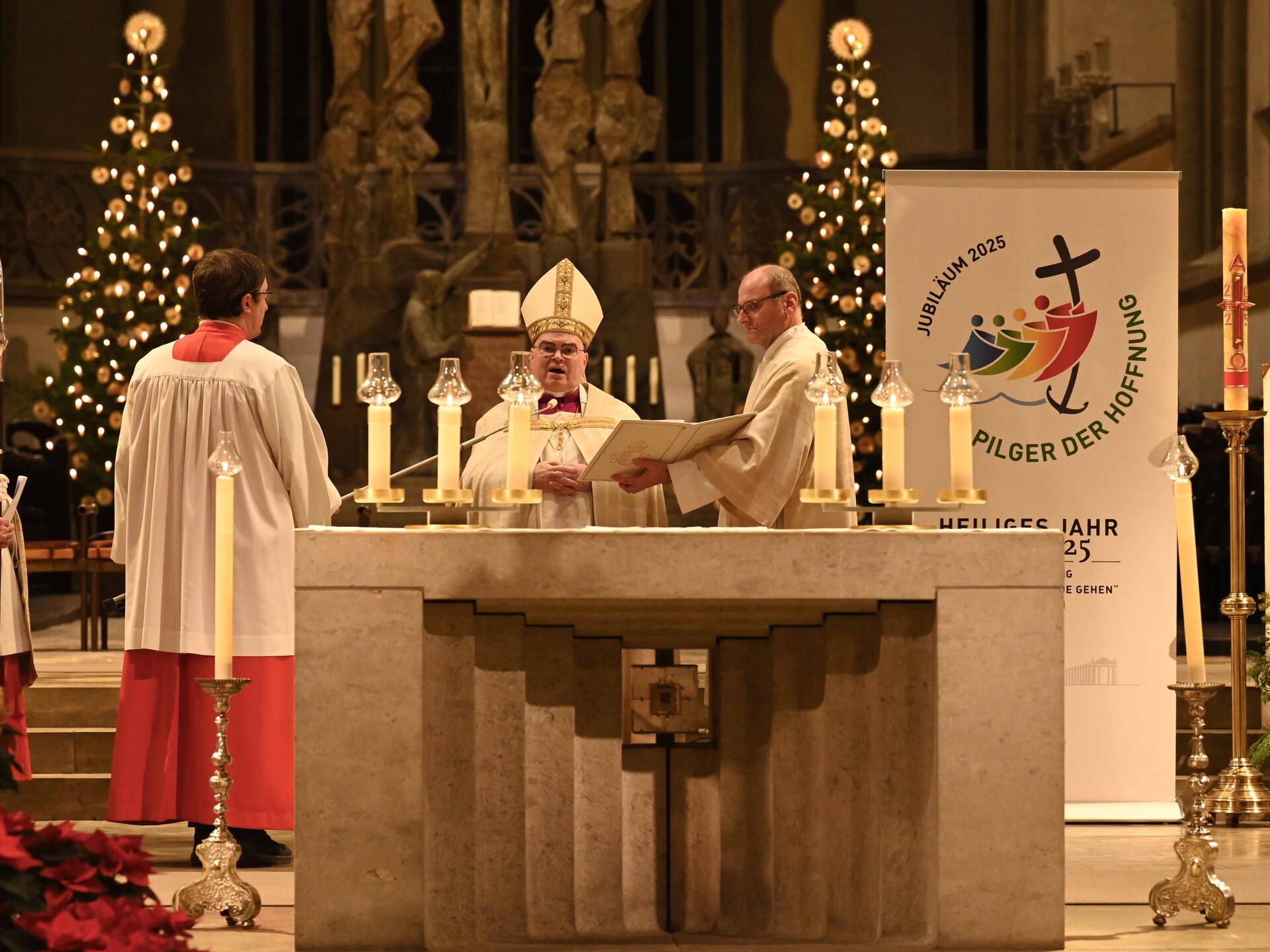 Im Anschluss an seine Silvesterpredigt verabschiedete Bischof Bertram das Heilig Jahr. Hymne und Kerze standen symbolisch für diesen besonderen Anlass. Papst Franziskus hatte es am Weihnachtstag 2024 unter dem Motto „Pilger der Hoffnung“ eröffnet. Hoffnung, so Bischof Bertram, sei aber nicht einfach nur ein frommer Wunsch, sondern eine Kraft aus dem Herzen Gottes, die unser Leben trage. „Am Ende dieses Jahres danken wir Gott für alles, was er uns in diesem Heiligen Jahr geschenkt hat: für Trost in der Not, für jeden Neuanfang, für jeden Funken Hoffnung, den er in uns geweckt, und für jeden Schritt aufeinander zu, den er ermöglicht hat.“ Die Heilige Pforte schließe sich, doch Christus, die lebendige Tür zum Vater, bleibe für uns geöffnet. Bischof Bertram: „Gott gebe uns Kraft und Mut, jedem zu antworten, der nach dem Grund unserer Hoffnung fragt.“