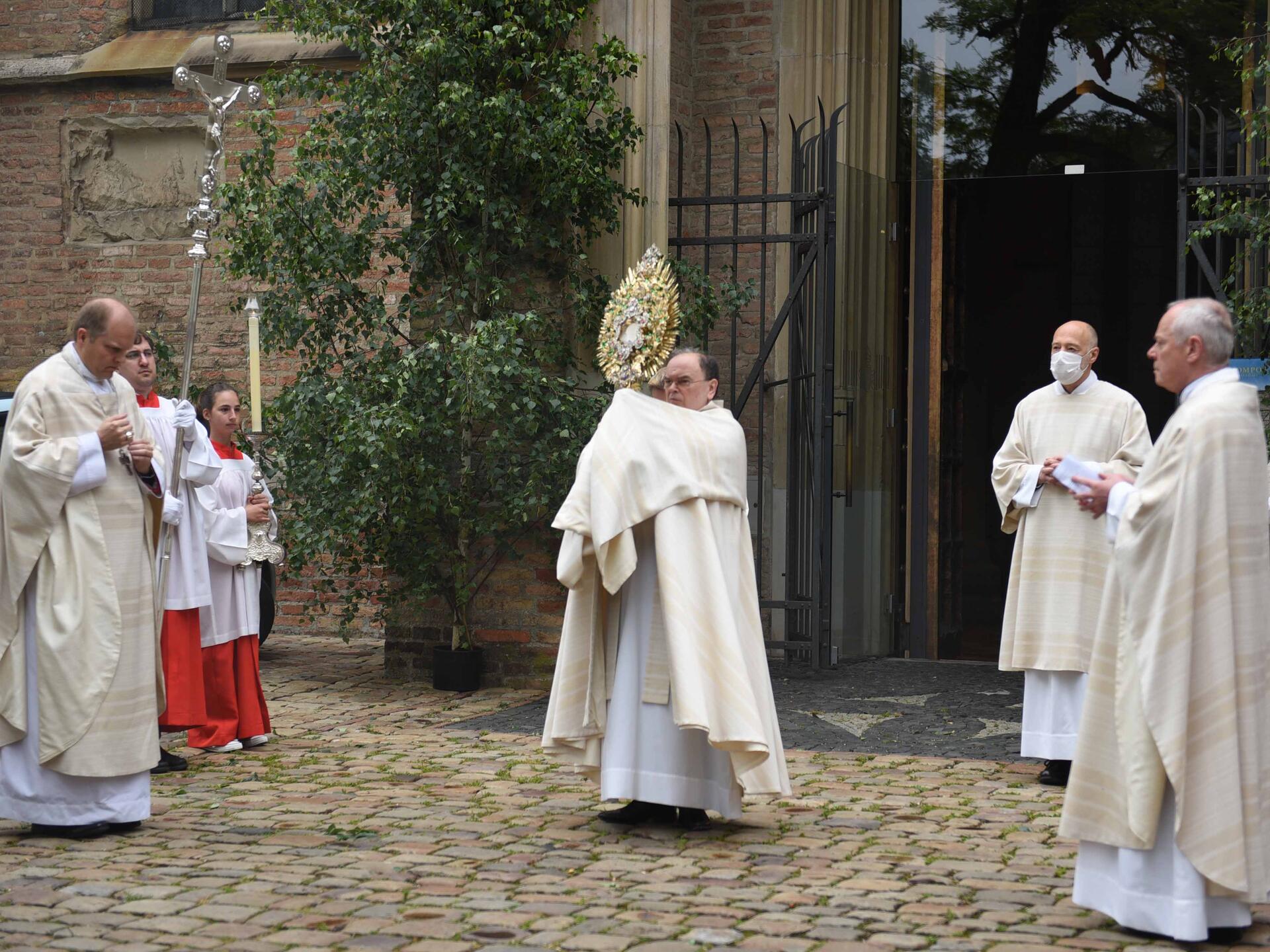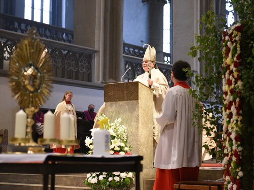 Augsburg (pba). Bischof Dr. Bertram Meier hat in seiner heutigen Predigt zum Fronleichnamsfest im Augsburger Dom dazu aufgerufen, die Botschaft von Fronleichnam und das Wort „Prozession“ ernst zu nehmen. Für die Kirche bedeute das, hinauszugehen, fortzuschreiten, sich weiterzuentwickeln. „Jesus will keine ‚Konservenkirche‘“, die auf der Stelle trete, rief Bischof Bertram den rund 150 Gläubigen im Augsburger Dom zu. Die traditionelle Fronleichnamsprozession durch die Augsburger Innenstadt im Anschluss an das Pontifikalamt konnte heuer aufgrund der Corona-Krise nicht stattfinden. Stattdessen hielt Bischof Bertram zusammen mit den Weihbischöfen und dem liturgischen Dienst eine Statio auf dem Domplatz und segnete die Stadt sowie ihre Bewohner.