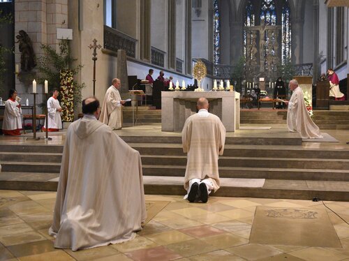 Das Gegenteil von Prozession sei Rezession, also nach hinten gewandt, in die Krise. „Das können wir nicht wollen.“ Nicht Rezession, sondern Prozession, laute die Botschaft der Stunde. „Für die Kirche gibt es keinen Fortschritt im Rückwärtsgang. Sie soll Schritt halten mit den Menschen. Sie muss beweglich bleiben, um neue Wege zu finden, damit das Evangelium Jesu Christi auch heute ankommt.“ Die Kommunikation sei hier ein wichtiges Stichwort, stellte Bischof Meier fest und rief zu einer Sprache auf, „für die man kein Fremdwörterlexikon braucht, sondern die das Volk hören und verstehen kann“