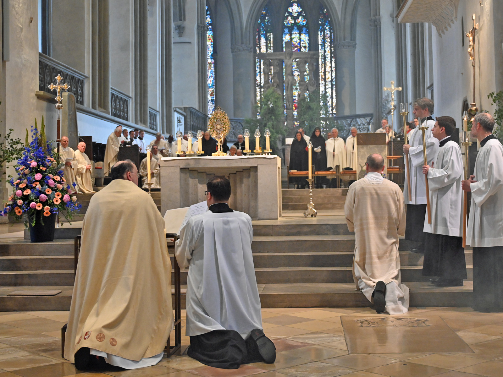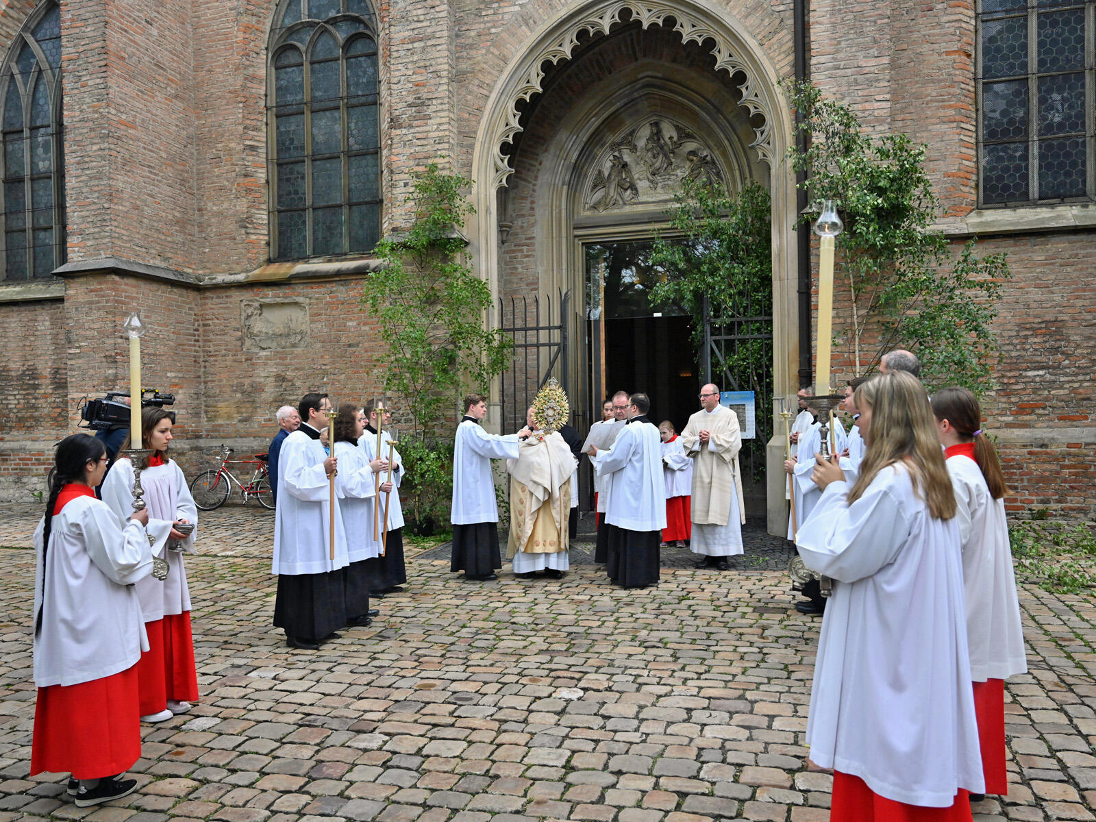 Zum Schluss des Gottesdienstes, an dem sich Gläubige verschiedenster Nationalitäten und muttersprachlicher Gemeinden als Lektoren beteiligten, war die Gemeinde zur Eucharistischen Anbetung eingeladen. Diese schloss mit dem feierlichen sakramentalen Segen, den der Bischof zunächst vom Domplatz aus in alle vier Himmelsrichtungen der Stadt, anschließend im Dom der anwesenden Gemeinde spendete. Mit dem festlichen „Te deum“ endete die Feier. Die musikalische Gestaltung hatten der Kammerchor und der Karl-Kraft-Chor der Augsburger Domsingknaben und das Bläserensemble der Dommusik übernommen. Zur Aufführung kamen die Missa de Angelis sowie Chorsätze zu den klassischen Sakramentsliedern von Karl Erhard, Wolfram Menschick und Arthur Piechler.