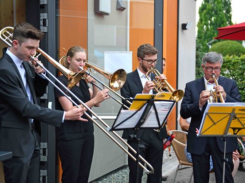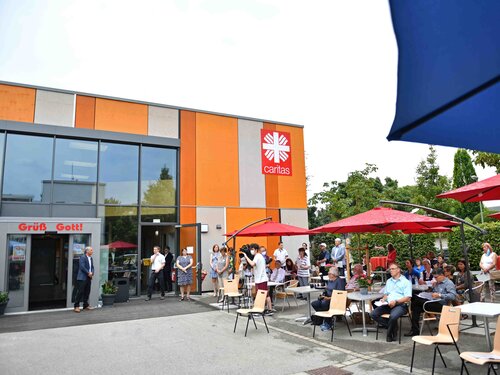 Heute steht das Zentrum mit seinen Angeboten für Menschen in schwierigen Lebenslange, mit dem Café Werthmann und seinen Mittagstisch, seiner Näherei, den Gebrauchtbücherverkauf und den buntem Angebot an Kleinwaren nahezu baugleich an derselben Stelle. Seit dem 1. Januar dieses Jahres ist das Zentrum wieder eröffnet. Bischof Bertram weihte es nun offiziell etwas mehr als zwei Jahre nach der Brandkatastrophe ein. Letztlich, so der Bischof, habe das Feuer der Zerstörung nicht gesiegt, es sei erloschen. „Hier soll das Feuer der Liebe, das Feuer der Caritas weiterbrennen“, sagte er in seiner Ansprache im Rahmen des Wortgottesdienstes. Gäste aus der Bistumsleitung, der Barmherzigen Schwestern, der Maria Stern-Schwestern und der Caritas nahmen an der Feier auf dem Innenhof des Zentrums teil. Musikalisch umrahmt wurde die Feier vom Bläserquartett Geirhos aus Bobingen und der Hausband des Augsburger Stadt-Caritasverbandes mit dessen Geschäftsführer Dr. Semsch an der Gitarre.