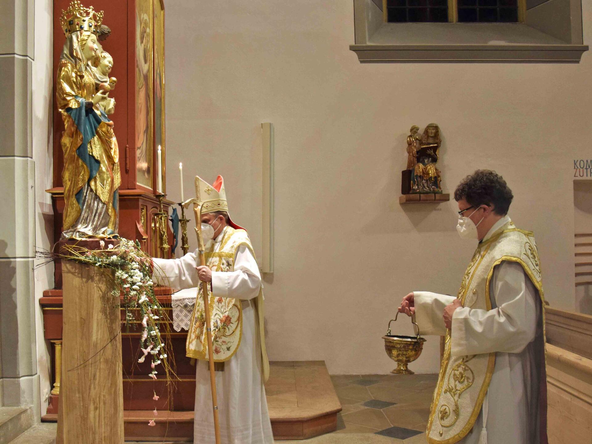 In seiner Predigt widmete sich der Weihbischof dem Thema Maria. Gott habe sich eine würdige Wohnung in ihr gesucht, als er sie für die Geburt des Herrn auserwählte. Maria habe gesagt: „Ich bin die Magd des Herrn.“ Nun, da die spätgotische Figur der „schönen Oberstdorferin“ in neuem Glanz erstrahle und auf einem Eichensockel auf Traufberger Marmor stehe, könnten die Gläubigen Maria neu ansehen. Maria, die „Königin des Himmels“, sei durch ihre neue Anordnung nun nah bei den Menschen. „Maria ist die Autobahn, der ICE auf dem Weg zu Gott. Sie nimmt uns an die Hand, um uns zu Gott zu führen“, betonte Wörner. Er hoffe, dass die Gläubigen und auch die Urlaubsgäste bald wieder vor Ort die Nähe Gottes erfahren könnten, schloss der Weihbischof seine Ansprache.