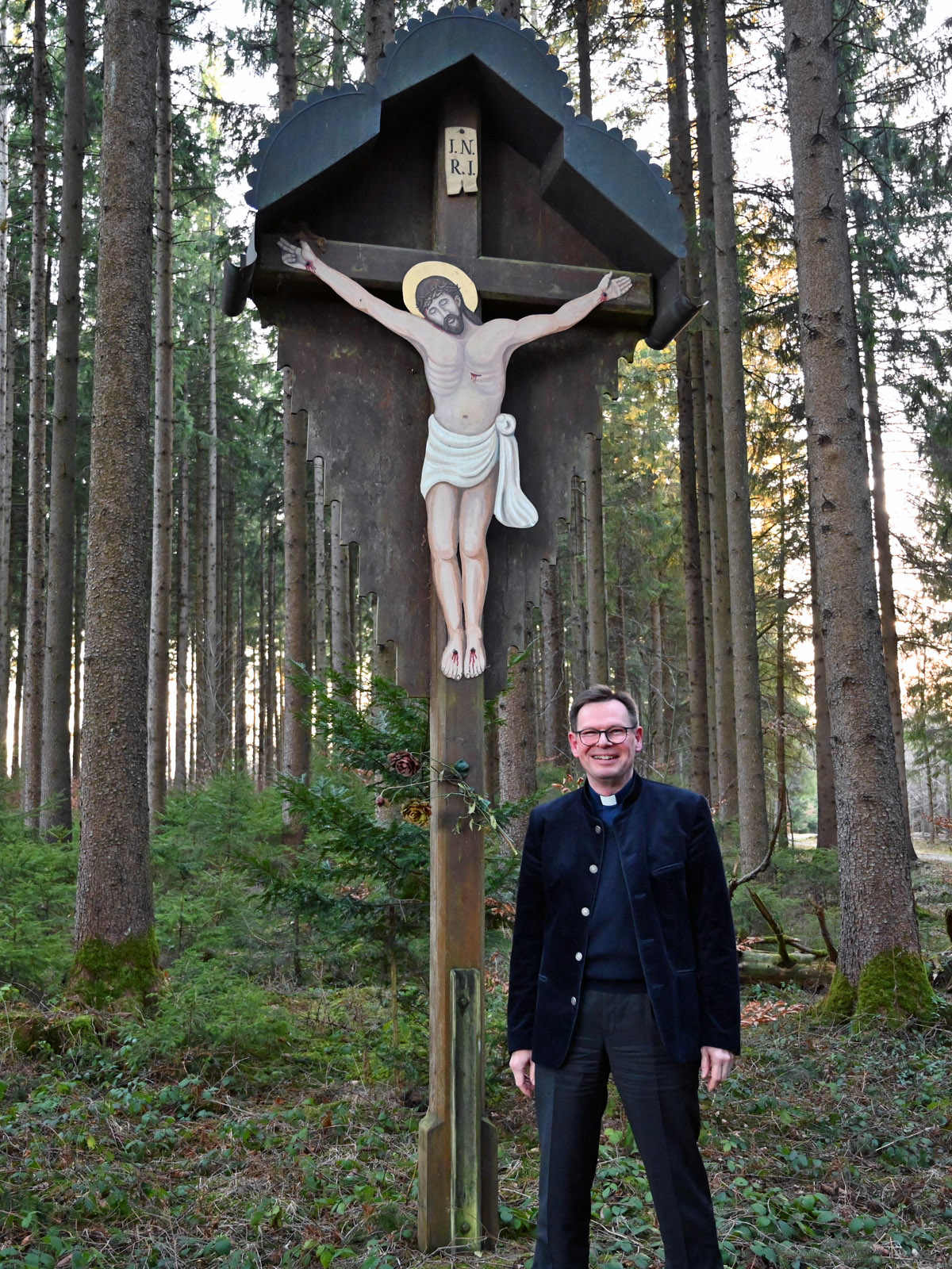 Ein fester Bestandteil seines Alltages sind auch die morgendlichen Spaziergänge, während denen er auch den Rosenkranz betet und den Tag gedanklich vorbereitet. Die Gegend selbst bietet sich auch für lange Wanderungen an. Urige Bauernhöfe, kleine Dörfer, Hofkapellen und zahlreiche Kreuze liegen am Wegesrand. So lässt er auch das Foto bei fast schon romantischem Sonnenuntergang an einem Marterl im Unterdießener Wald aufnehmen. Ausnahmsweise fährt er dafür mit seinem sportlichen BMW die unbefestigten Waldwege entlang.