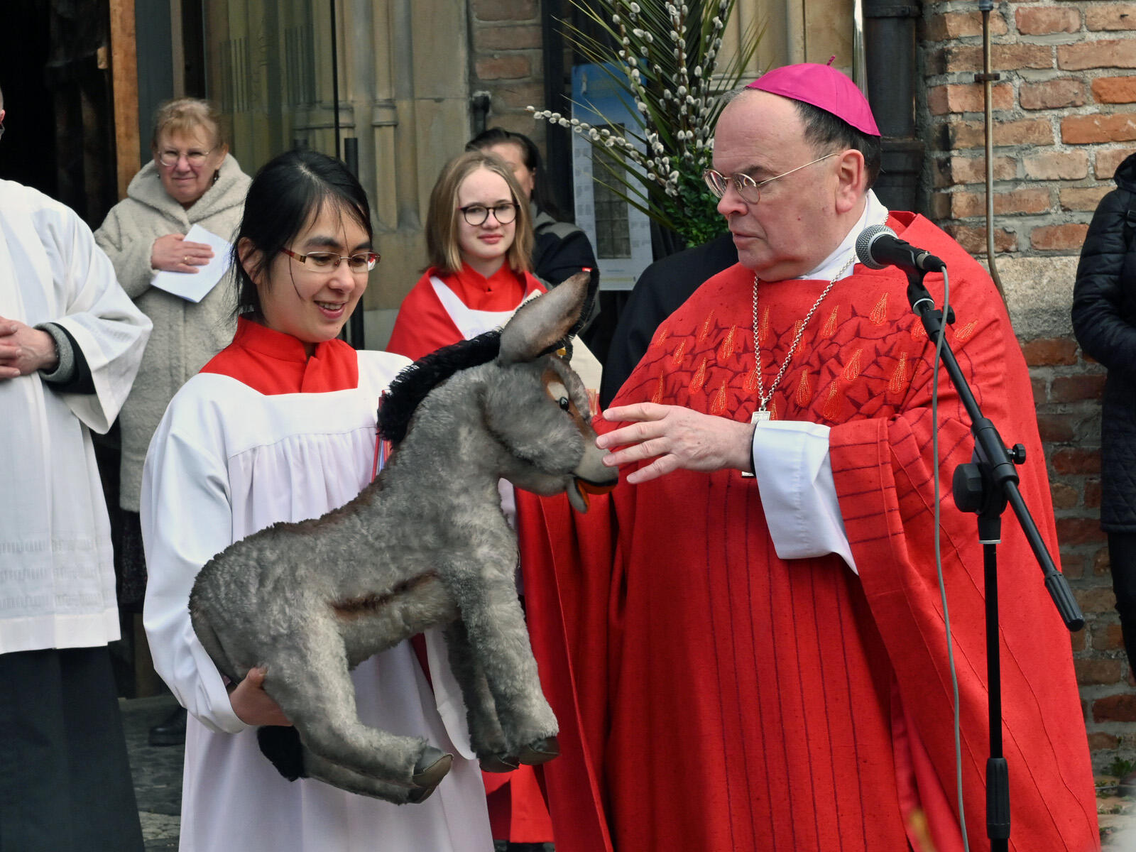 Im Anschluss an die Segnung sprach Bischof Bertram eine Einladung aus: „Nehmen wir all die Dinge, die uns im Herzen liegen, mit in diese Woche hinein, und bitten wir Gott, dass er auch uns mit neuem Leben erfüllt.“ Den anwesenden Kindern überreichte er für den anschließenden Kindergottesdienst im Pfarrheim symbolisch einen Stofftier-Esel. Auch die jüngsten Mitglieder der Pfarrei wussten über dessen Bedeutung für den Palmsonntag sehr gut Bescheid. Der sprichwörtliche Palmesel im Hinblick auf das späte Aufstehen am Morgen wollte aber keiner sein.